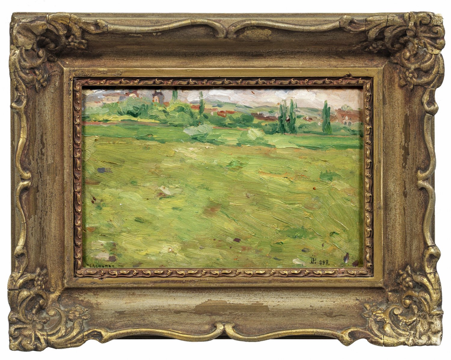 Impressionistisches Werk des jüdischen Malers, der in Ungarn und an der Académie Julian in Paris studierte. Öl/Holztafel. R. u. monogr. u. dat. (1)898. Verso sign. u. dat. 1898 mit undeutl. Ortsangabe. 16 cm x 24 cm. Rahmen.