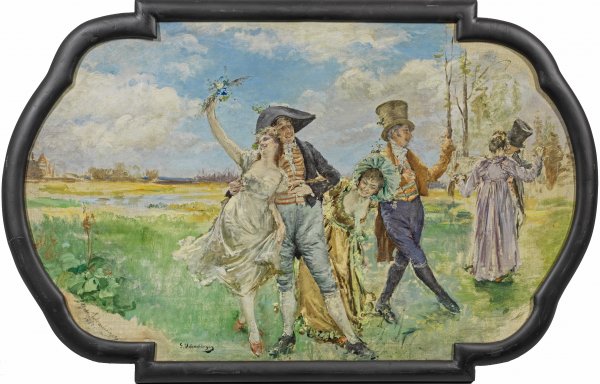 Querovales, passig geschweiftes, wohl als Supraporte konzipiertes Gemälde. Mit lockerem, hellem, pastelltonigem Duktus stellte Schachinger drei elegante, vornehme Paare am Ende des 18. Jhs. in tänzerischen, fröhlichen Posen dar, die er vor den Hintergrund einer sonnenbeschienenen Landschaft komponierte. Schachinger studierte an der Kunstakademie in München bei Hermann Anschütz, Alexander von Wagner und Carl Theodor von Piloty. 1876-1878 hielt er sich als bayerischer Staats-Stipendiat in Italien auf. Nach seiner Rückkehr nach München wurde er zu einem gefragten Künstler, der außer durch Blumenstillleben u. a. durch Porträts, Genrebilder und großformatige Dekorationsgemälde bekannt wurde. Sein berühmtestes Werk als Hofmaler ist sein 1887 vollendetes Bildnis König Ludwig II. von Bayern in Schloss Herrenchiemsee. Öl/Lwd.; L. u. sign. sowie ein zweites Mal am linken unteren Bildrand sign. u. dat. 1895. 61 cm x 99 cm. Rahmen.
