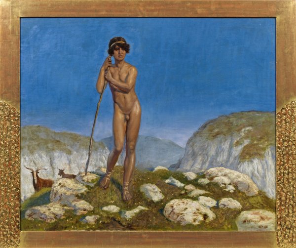 Auf einem Felsplateau vor einer lichtdurchfluteten, morgendlichen Berglandschaft stehender Jüngling als Akt. Für das Oeuvre Herrfeldts seltenes, homoerotisches Motiv. Der Maler studierte in München, Florenz und Paris u. a. bei Franz von Stuck. Als Mitglied der Münchener Künstler-Genossenschaft stellte Herrfeldt 1921 erstmals aus und fand mit seinem Gemälde "Sklavin" auf der Ausstellung im Glaspalast größere Beachtung. Herrfeldt spezialisierte sich auf weibliche Aktdarstellungen, oft in explizit lasziv-erotischen Posen, wobei er sowohl blonde Schönheiten in Strandszenen als auch verführerische südländische Frauen, Spanierinnen und Orientalinnen darstellte, die den exotisch-mystischen Reiz des "Orients" widerspiegeln. Öl/Lwd.; R. u. sign.; 100,5 cm x 121 cm. Rahmen.