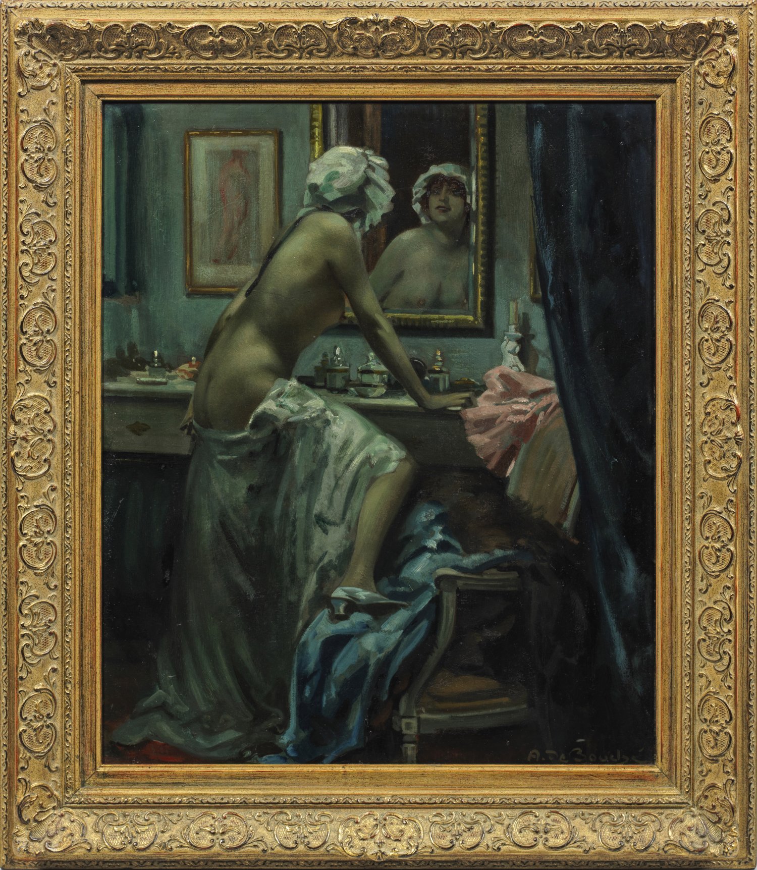 Szenische Darstellung mit einer sich im Spiegel betrachtenden, jungen Frau. In Motiv und Stil charakteristisches Aktbild des Künstlers, der an der Münchener Akademie bei Gabriel von Hackl und Paul Hoecker studierte. Ab 1901 beschickte er die Ausstellungen im Münchener Glaspalast, 1904 und 1914 nahm er überdies an den Großen Berliner Kunstausstellungen teil. Öl/Malkarton. R. u. sign.; 67 cm x 56 cm. Rahmen.