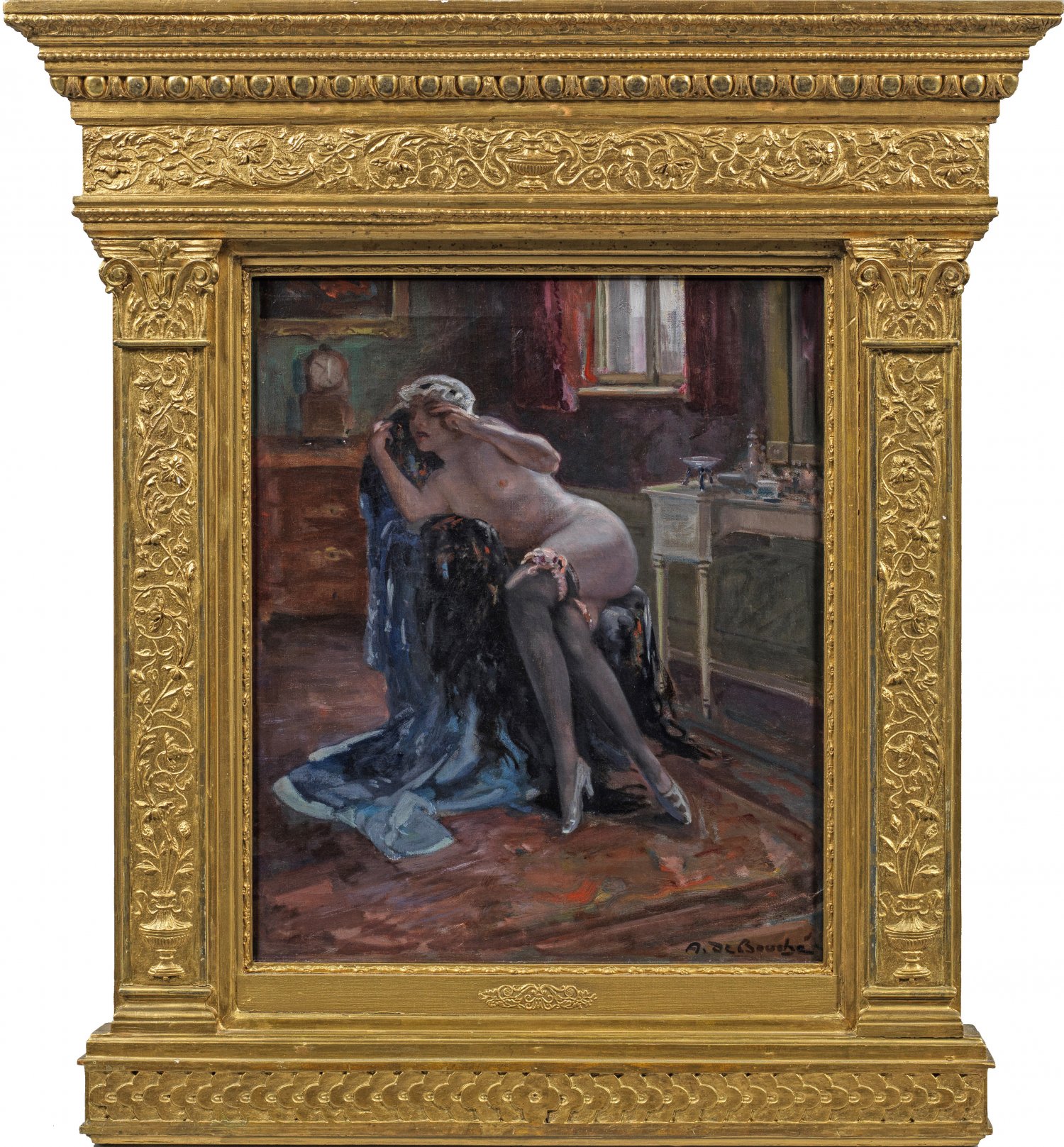 Sitzender weiblicher Akt im Boudoir. Mit weicher Lichtführung und nuanciertem Farbenschmelz gemaltes, motiv- und stiltypisches Werk des Künstlers. Schwerpunkt des Oeuvres von Arnulf de Bouché waren laszive Darstellungen verführerischer, weiblicher Akte, deren erotischen Reiz er oft durch ein exotisches, orientalisches Flair steigerte. Ab 1901 beschickte er die Ausstellungen im Münchener Glaspalast, 1914 nahm er überdies an den Großen Berliner Kunstausstellungen teil. Öl/Lwd.; R. u. sign.; Verso betitelt. 63,5 cm x 54 cm. Prunkrahmen.