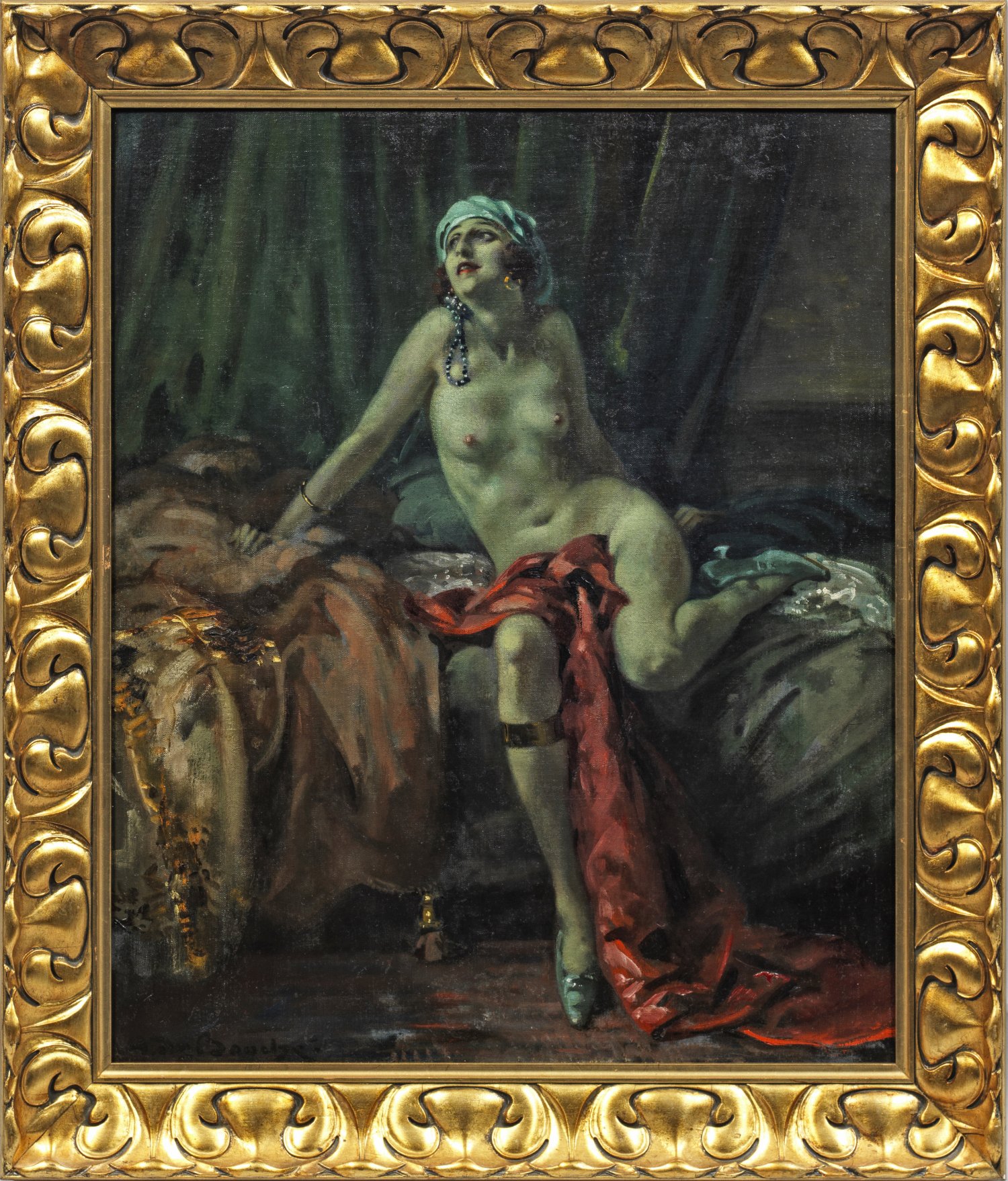 Traumverloren auf einem Bett sitzender Akt einer jungen Frau mit orientalischen Attributen, entstanden wohl um 1913. Schwerpunkt des Oeuvres von Arnulf de Bouché waren laszive Darstellungen weiblicher Akte, deren erotischen Reiz er oft durch ein exotisches, orientalisches Flair steigerte. Ab 1901 beschickte er die Ausstellungen im Münchener Glaspalast, 19o4 und 1914 nahm er überdies an den Großen Berliner Kunstausstellungen teil. Öl/Lwd., doubl; L. u. sign.; 65 cm x 54 cm. Rahmen.