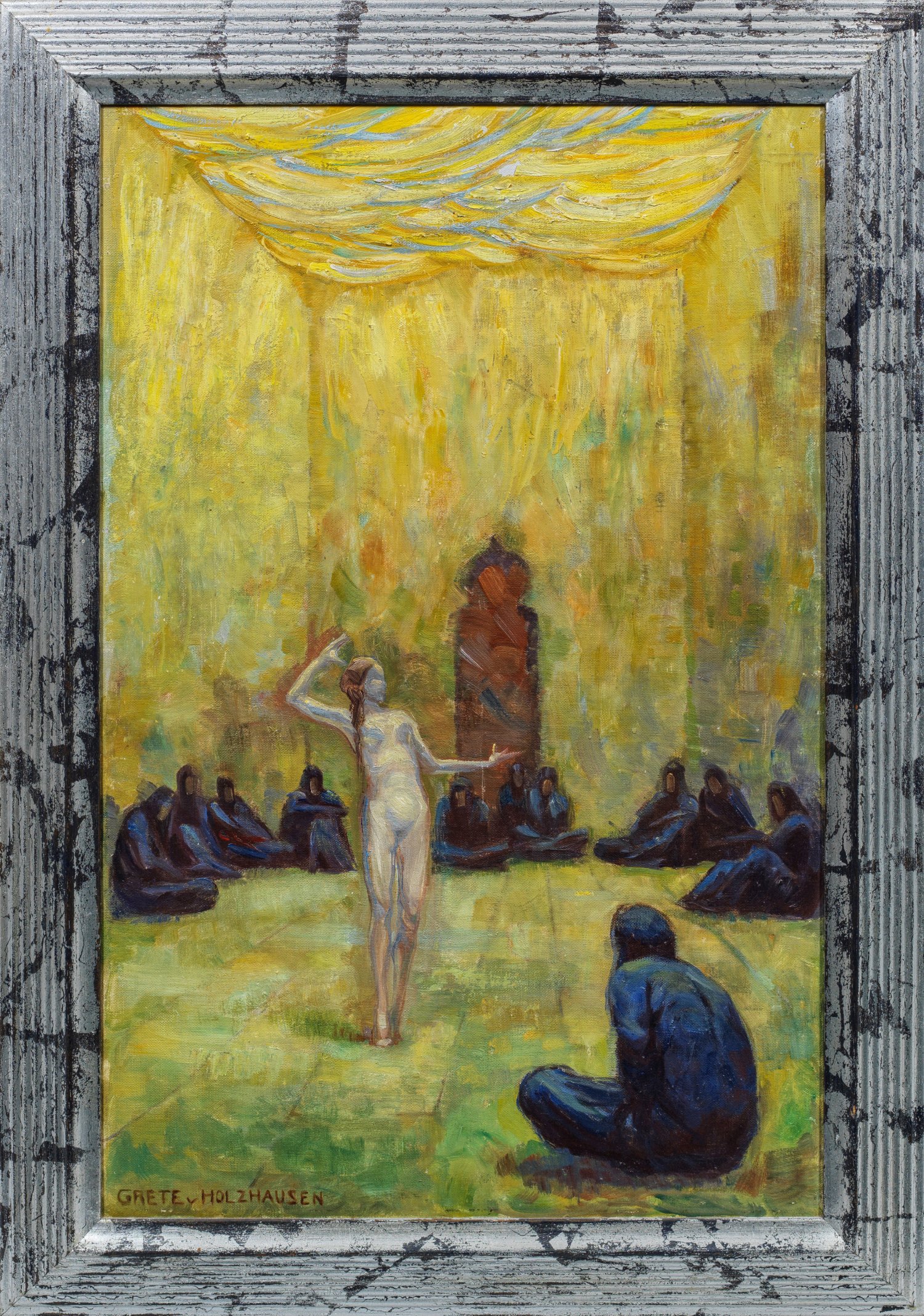 In der Mitte eines Saales stehender Akt einer jungen Frau in expressiver Pose, umringt von einem Kreis sitzender Figuren in dunkelblauen, verhüllenden Gewändern. Seltenes, wohl um 1910-1921 geschaffenes Gemälde der Bildhauerin, Malerin, Kinderbuchautorin, Illustratorin und Keramikerin, die 1930 den Österreichischen Staatspreis gewann. In ihren meist in kräftigen, kontrastreichen, leuchtenden Farben gemalten Arbeiten verband sie Einflüsse aus Symbolismus, Jugendstil und Expressionismus. Öl/Karton. L. u. sign.; 70,5 cm x 46,5 cm. Rahmen.