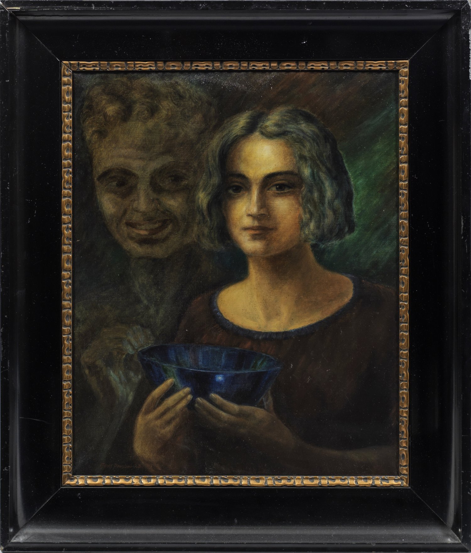 Frühes, in der Tradition des Symbolismus, der Werke von Franz von Stuck und des Münchner Jugendstils stehendes Werk Presbers. Der Künstler studierte 1919-1922 an den Kunstgewerbeschulen in Wiesbaden und Mainz, ab 1922 bei Peter Halm an der Münchener Kunstakademie. Öl/Lwd.; L. u. sign. u. dat. 1923. 61 cm x 50 cm. Rahmen.