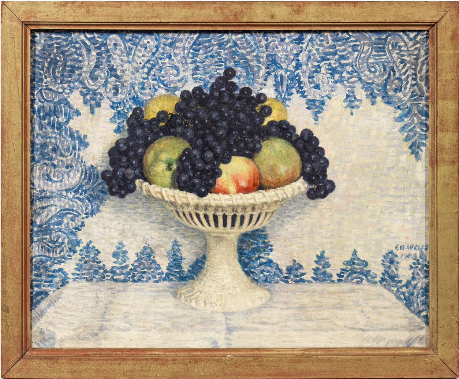Frühes, impressionistisches Stillleben des Künstlers aus seiner Zeit an der Malschule des von ihm begründeten Folkwang-Museums in Hagen (1903-1906), an die ihn Karl Ernst Osthaus berufen hatte. 1907 wurde Weiß Lehrer an der renommierten Unterrichtsanstalt des Berliner Kunstgewerbemuseums und Mitglied der Berliner Secession, 1910-1933 lehrte er als Professor (ab 1924 an den späteren Vereinigten Staatsschulen für Freie und Angewandte Kunst). 1922 nahm ihn die Preußische Akademie der Künste zu Berlin auf. 1933 entzogen die Nationalsozialisten Weiß das Lehramt, 1937 folgte sein Ausschluss aus der Akademie der Künste. Stillleben aus der frühen Schaffensperiode des Künstlers befinden sich u. a. in der Nationalgalerie in Berlin, im Museum Ludwig in Köln, im Osthaus Museum in Hagen und im Museum Folkwang in Essen. Öl/Lwd.; R. u. sign. u. dat. 1903. 49 cm x 61 cm. Rahmen.