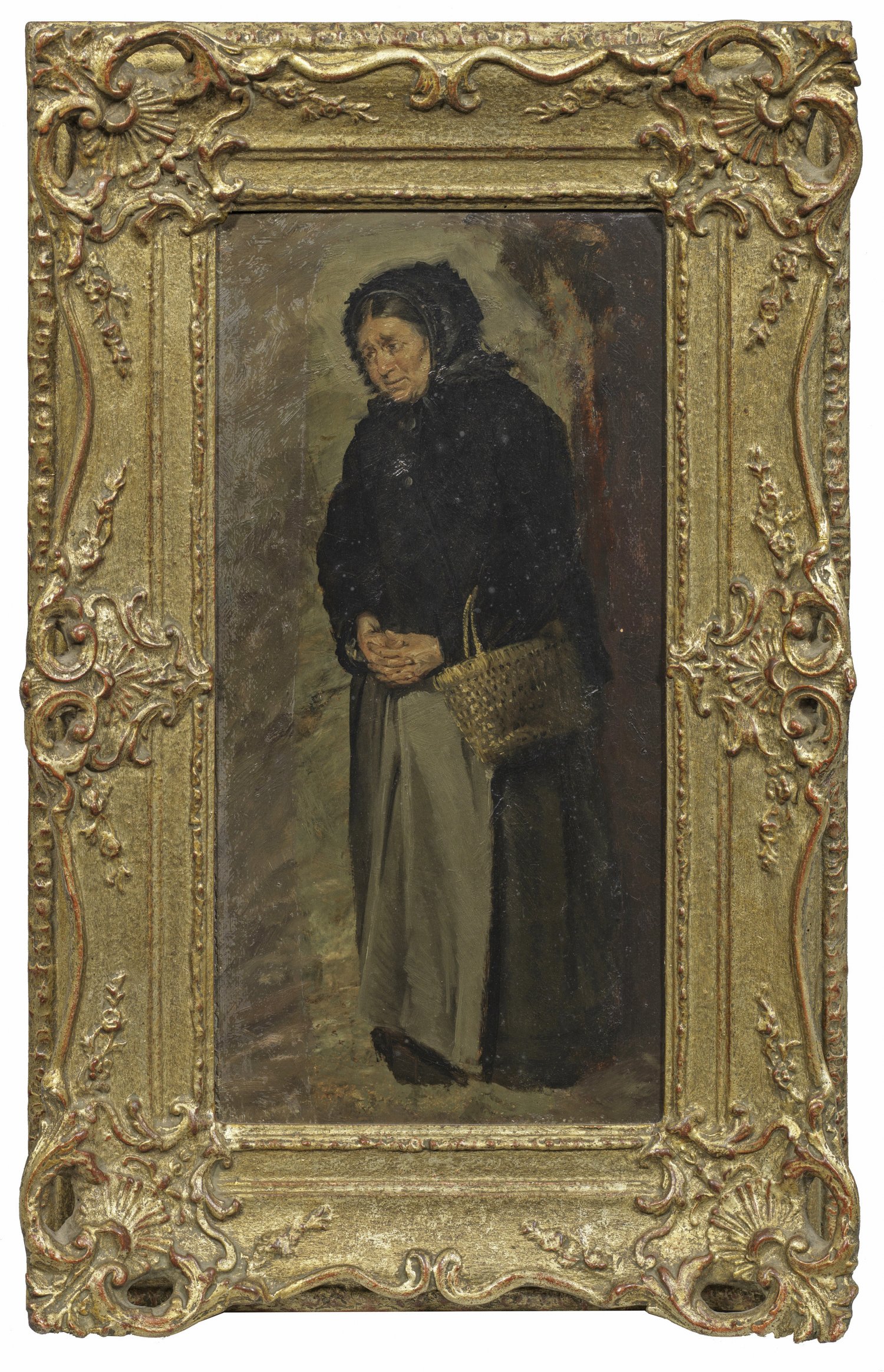 Wohl um 1870 entstandenes Bildnis aus dem engsten Leibl-Kreis. Motiv und realistischer Stil deuten auf ein Werk von Theodor Alt (1846 - 1937) hin, der mit Leibl in München studierte und 1869-1873 ein gemeinsames Atelier hatte. Öl/Papier (oder dünner Karton), auf Hartfaser kaschiert. 39,5 cm x 20 cm. Rahmen.