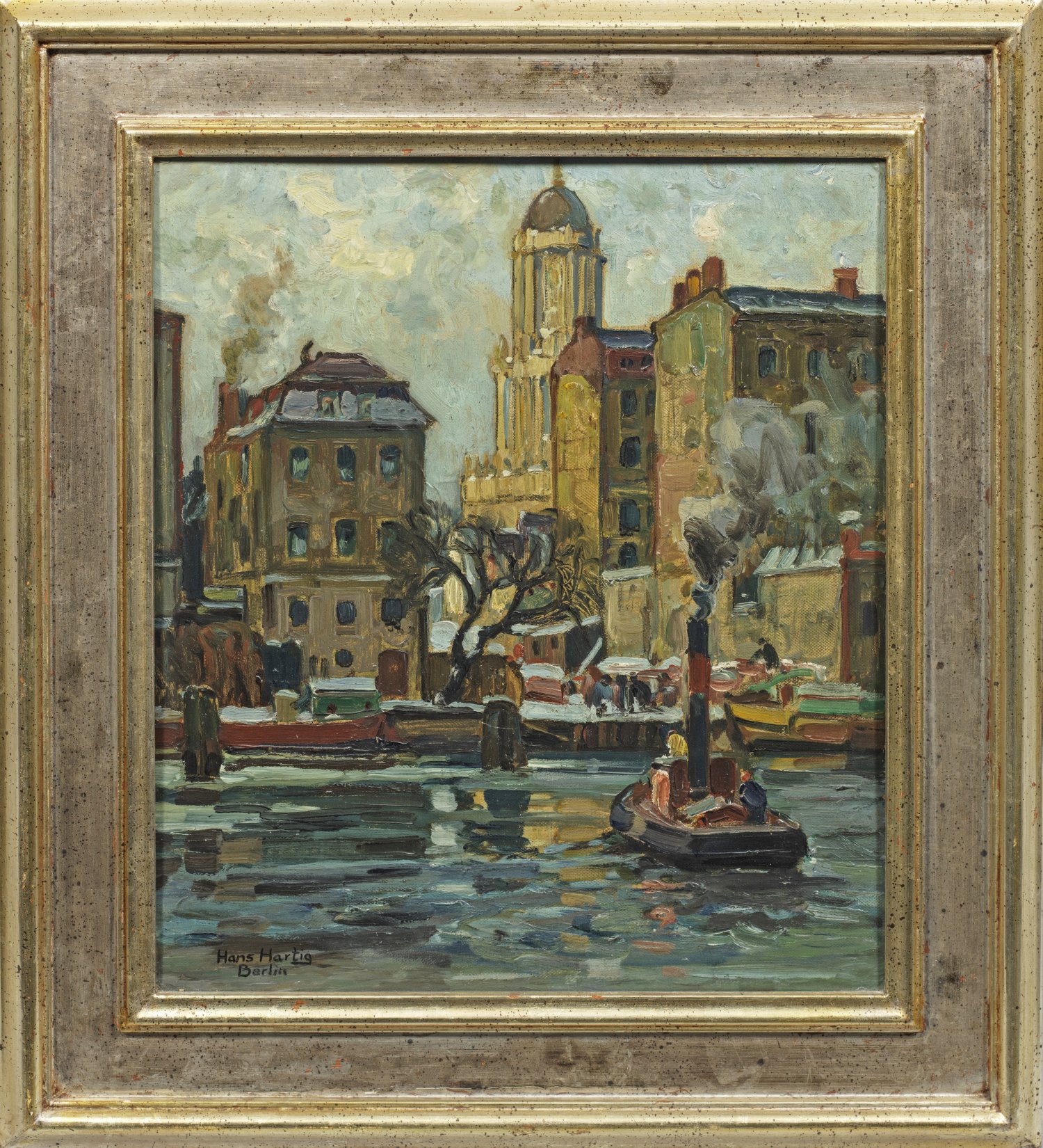 Um 1918 entstandene impressionistische Vedute Hartigs, der zu Ende des I. Weltkriegs die Großstadt Berlin als Motivschatz entdeckte. Der Meisterschüler Eugen Brachts debütierte 1901 mit sensationellem Erfolg auf der Großen Berliner Kunstausstellung und beteiligte sich ab 1906 an den Ausstellungen der Berliner Secession. Öl/Malkarton. L. u. sign. mit Ortsangabe Berlin. Verso Etikett der Retrospektive "Hans Hartig 1873-1936", Stiftung Pommern, Schloss Rantzaubau, Kiel, 1998, Nr. 68. 41 cm x 36,5 cm. Rahmen.