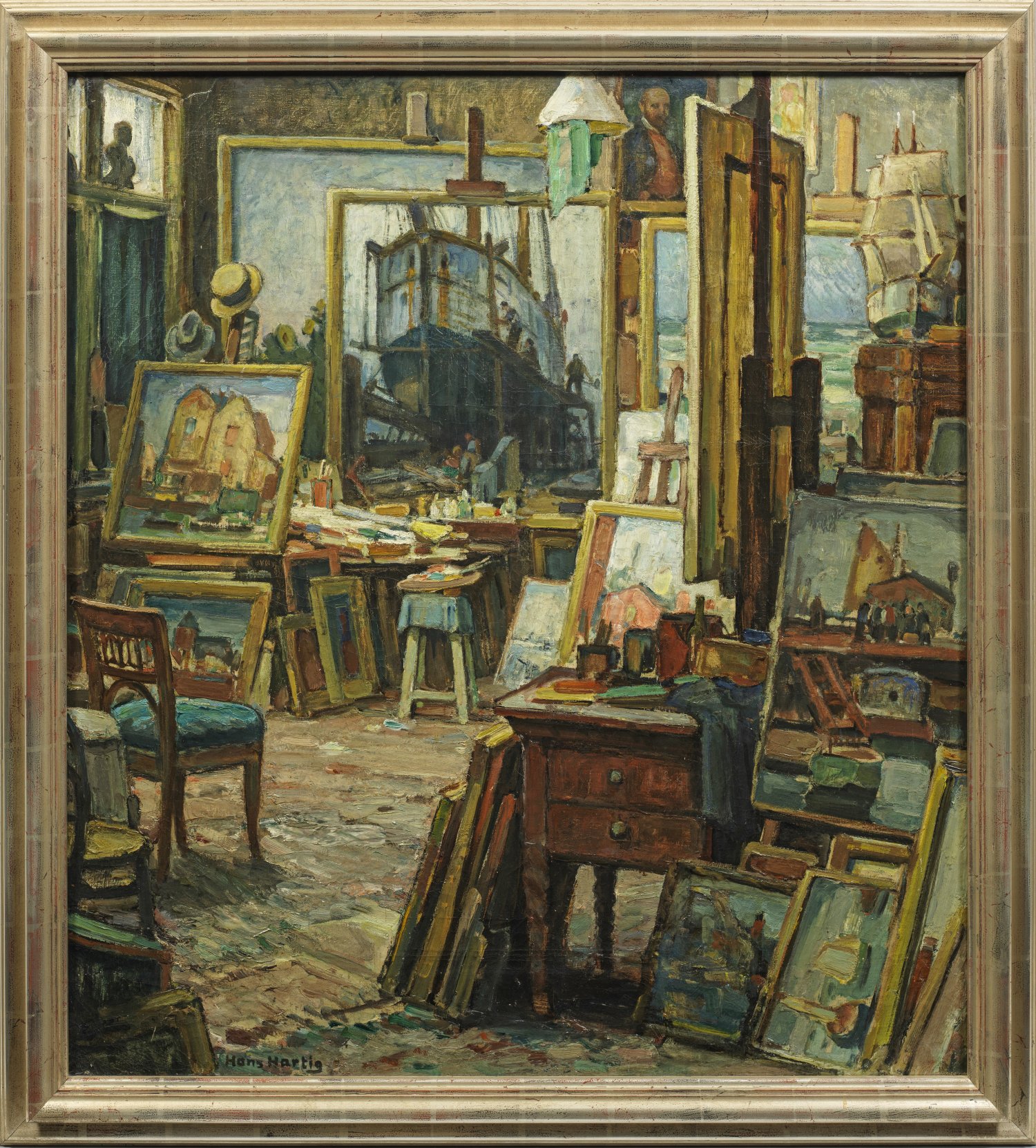 Impressionistisches Interieurbild des von Paul Vorgang und Eugen Bracht an den Akademien in Berlin und Dresden ausgebildeten Malers. 1901 beteiligte sich Hartig mit sensationellem Erfolg an der Großen Berliner Kunstausstellung, es folgten ab 1906 Ausstellungen der Berliner Secession. Öl/Lwd.; Sign.; Verso betitelt u. dat. (19)29; vom Künstler bez. mit Berliner Adresse, Ligatur-Monogr. "HH" mit (Werk?-)Nr. 1201. 100 cm x 91 cm. Rahmen.