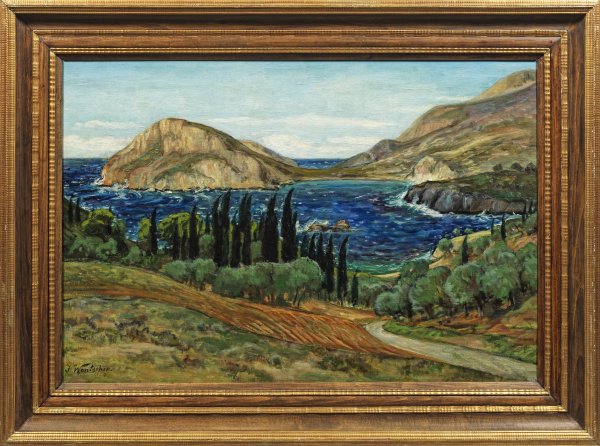 In den 1920er Jahren entstandene, große Landschaft Wentschers, der hierin impressionistische und expressionistische Stilelemente verbindet. Wentscher lernte bei seinem als Landschaftsmaler tätigen Vater und an der Académie Julian in Paris. Nach 1918 wurde er in Berlin ansässig, ab 1921 unternahm er Studienreisen, die u. a nach Griechenland und Italien führten. 1933 emigrierte Wentscher mit seiner Frau nach Asien, 1940 wurden sie nach Australien deportiert, wo sie sich später in Melbourne niederließen. Öl/Lwd.; L. u. sign.; Verso auf altem Etikett bez. "Leukas (/) Blick von Südwesten auf Vlicho". 83,5 cm x 126 cm. Rahmen.
