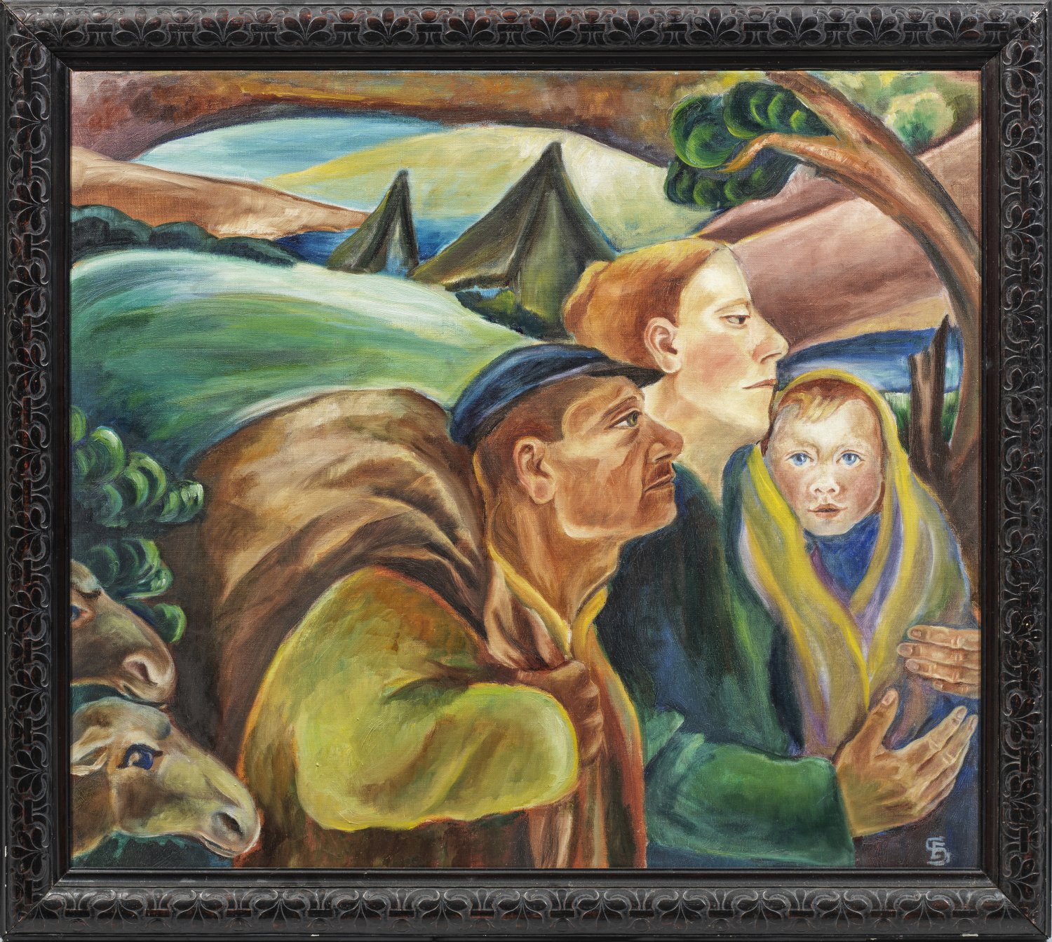 Expressionistische Darstellung der "Flucht nach Ägypten". Seltenes Gemälde Schnells, von der nur wenige Werke bekannt sind. Schnell studierte an der Akademie in Königsberg und lernte durch einen Paris-Aufenthalt in den 1920er Jahren die dortigen Kunstströmungen kennen, wodurch sie Einflüsse des deutschen Expressionismus und der französischen Moderne verband. Ende der 1920er Jahre hatte Schnell eine Einzelausstellung im Kunstsalon Franke in Königsberg; 1930 gehörte sie zum ausgesuchten Künstlerkreis einer von Paul Westheim arrangierten Ausstellung in Berlin (u. a. mit Werken von Schlemmer). Er rühmte die kurz zuvor verstorbene Künstlerin posthum: "Eine erstaunliche Begabung, erstaunlich in ihrer Eigenart, erstaunlich die visionäre Kraft ihrer Gesichter, erstaunlich die sichere Beherrschung der malerischen und tektonischen Ausdrucksmittel." (Zit. aus "Das Kunstblatt", 1930, S. 260). 1931 fand eine Gedächtsnis-Ausstellung in den Kunstsammlungen im Schloss Königsberg statt. Öl/Lwd.; R. u. Ligatur-Monogr.; 79 cm x 90,5 cm. Rahmen.