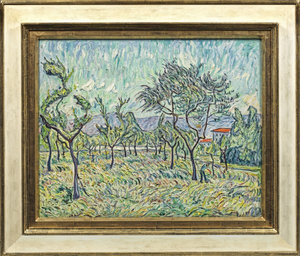 Mit rhythmischem, teilw. furiosem Duktus und stark pastosem Farbauftrag ausgeführtes Hauptwerk Brockhusens, das den prägenden Einfluss Vincent van Goghs widerspiegelt. Dieses Gemälde gehört zu einer Werkreihe mit mehreren Florenz-Motiven, die während seines Stipendium-Aufenthaltes in der Villa Romana 1913 entstanden. Brockhusen studierte 1897/98-1903 an der Kunstakademie in Königsberg, wo er erste Landschaften in freier Natur schuf. 1904 ging er nach Berlin und wurde 1906 Mitglied der Berliner Secession. Nach seiner Rückkehr vom Villa-Romana-Aufenthalt nach Berlin 1913 gehörte er zu den Gründungsmitgliedern der Freien Secession, zu deren Vorstand er gehörte und 1919 auch deren Präsident wurde. Mit seinen während seines Florenz-Aufenthaltes entstandenen Italien-Bildern fand er Anerkennung in der Berliner Kunstszene und der kunstinteressierten Öffentlichkeit. Kurz vor dem Tod Brockhusens arrangierte sein neuer, zweiter Galerist Ferdinand Möller in Berlin eine Einzelausstellung; drei weitere Einzel- bzw. Gedächtnisausstellungen 1925, 1929 und 1931 in der Galerie Möller steigerten das posthume Renommee für Brockhusen. Öl/Lwd.; Verso zwei alte Etiketten mit Betitelung "Olivengarten II" und bez./dat. "Florenz 1913" sowie unterschiedlichen Nummern, außerdem ein Original-Etikett der Galerie Möller, Berlin (Verwalter des Künstlernachlasses) mit Bez. "Nr. 388, (26) v. Brockhusen [/] Florenz, Olivengarten [/] 1913". 86 cm x 106 cm. Rahmen.
