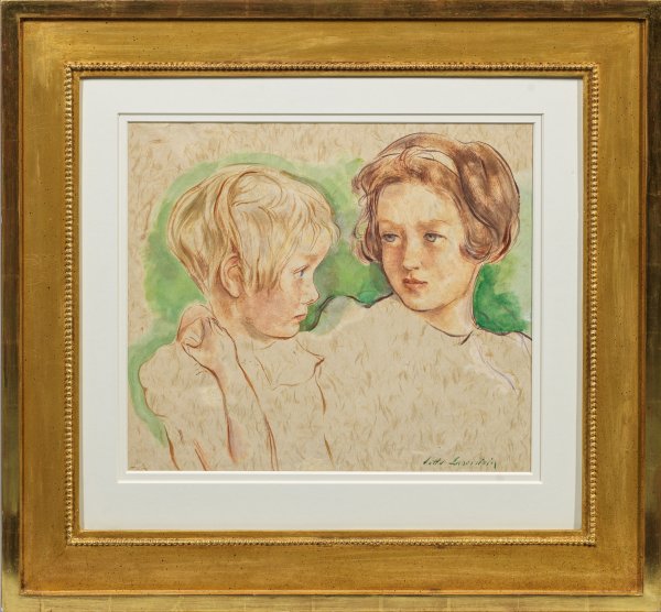 Einfühlsam porträtiert Laserstein in dem Blatt ein Mädchen mit einem jüngeren Kind, deren Haltung und Blick von einer engen innerlichen Verbundenheit zeugen, ganz auf die Gesichter konzentriert und durch den größtenteils freigelassenen Papiergrund im Ausdruck verstärkt. Der Stil und das verwendete Japanpapier deuten darauf hin, dass das Porträt in den 1930er Jahren entweder noch in Deutschland entstand oder in ihrer ersten Zeit in Schweden (ab 1937). 1927 hatte Laserstein ihr Studium an den Vereinigten Staatsschulen für Freie und Angewandte Kunst in Berlin als eine der ersten Frauen mit Auszeichnung abgeschlossen. 1928-1930 stellte Laserstein in der Akademie der Künste in Berlin aus. Zu ihrem Schaffensschwerpunkt wurde die Bildnismalerei, insbesondere junger, moderner Frauen fern von jeder damenhaften Repräsentation. Daneben malte und zeichnete Laserstein mit Vorliebe Kinder. Ab 1933 durch die Nationalsozialisten vom Kunstleben ausgeschlossen und wegen ihrer jüdischen Abstammung bedroht, emigrierte Laserstein 1937 mit einem Großteil ihrer Bilder nach Schweden. Lange gehörte die deutsch-schwedische Malerin zu den Künstlerinnen der sog. "Verlorenen" bzw. "Verschollenen Generation". Erst ab 1985 wurde ihre Bedeutung international durch Ausstellungen in London und Deutschland wiederentdeckt, ab 2003 durch mehrere große Retrospektiven. Aquarell u. Gouache mit Weißhöhungen/chamoisfarbenes, faseriges Japanpapier. R. u. sign.; Ca. 40,5 cm x 47 cm (Passepartoutausschnitt). Rahmen.