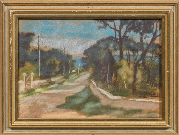 Die wohl in den 1960er Jahren entstandene, impressionistische und expressiv-realistische Stilemente verbindende Arbeit zeigt wahrscheinlich ein Motiv aus ihrer unmittelbaren Umgebung - 1952 erwarb sie ein Sommerhaus auf Öland und zog 1954 von Stockholm nach Kalmar. Pastell/Papier. R. u. sign.; Ca. 21 cm x 29,5 cm. Rahmen.