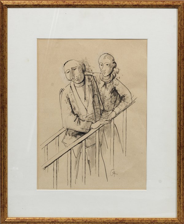 Um 1945-1947 entstandenes Blatt Hofers, der in jenen Jahren mehrfach Figuren auf Treppen schilderte. Dargestellt ist ein älterer Mann, der in enger Beziehung dicht neben einem jüngeren Mann steht, verbunden durch übereinander gelegte Hände. Außer dem Lebensalter- und Freundschaftsmotiv ist es auch als Vater-Sohn-Beziehung interpretierbar, zugleich als Hommage an das berühmte Gemälde "Bauhaustreppe" von Oskar Schlemmer aus dem Jahr 1932; Schlemmer war 1933 zusammen mit Hofer als Lehrer an den Vereinigten Staatsschulen für freie und angewandte Kunst in Berlin entlassen worden. Im "Dritten Reich" wurden Hofers Werke als "entartet" verfemt, er selbst wurde 1938 aus der Preußischen Akademie der Künste ausgeschlossen. Nach der Befreiung mit dem Kriegsende übernahm Hofer 1945 das Direktorat an der Hochschule für Bildende Künste in Berlin. Die Bedeutung Hofers liegt in seinem persönlichen, sensiblen, allgemeingültigen Menschenbild fern von jeglichem Pathos. Feder u. lavierte Tusche/Papier. R. u. Ligaturmonogr. "CH". 50 cm x 35 cm. Rahmen.