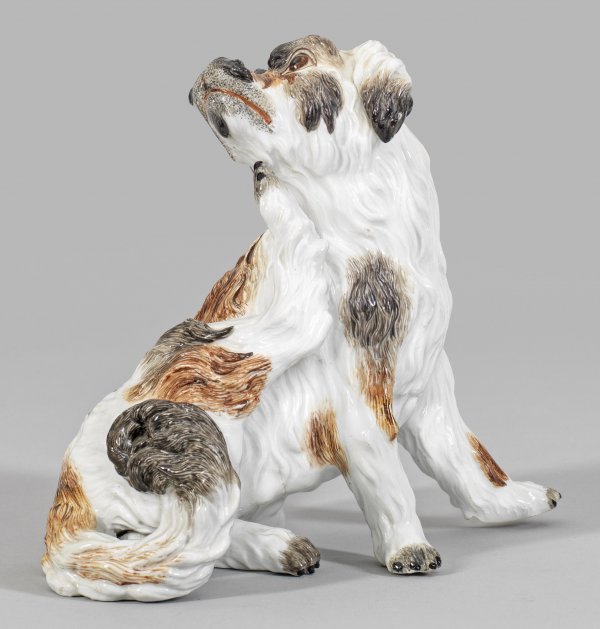 Seltene Figur "Sich kratzender Bologneser". Originaltitel sog. Wachtelhund. Sitzender, sich mit dem rechten Hinterlauf kratzender Bologneser. Reliefplastisch gearbeitetes, braun und schwarz geflecktes, weißes Fell. Dezente polychrome Malerei. Entw. Johann Joachim Kaendler. Rest.; H. 19,5 cm.