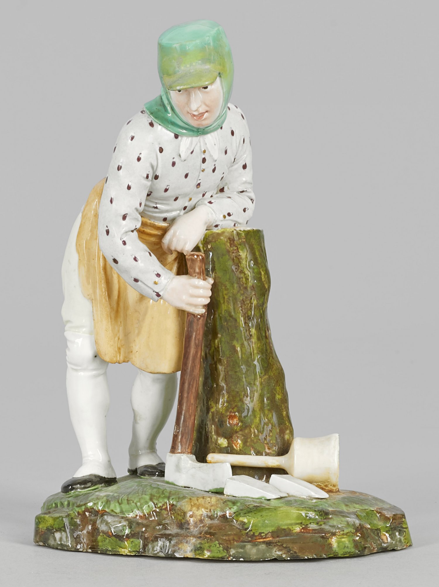 Holzfäller Auf naturalistisch staffiertem, grasbedecktem Sockel, in gebeugter Haltung stehender Holzfäller, sich mit dem linken Arm auf einen Baumstumpf stützend. In der rechten Hand eine Axt haltend. Zu seinen Füßen zwei liegende Axtschneiden und Holzhammer. Polychrome Malerei. Entw. Johann Peter Melchior. Rest.; Manufakturmarke. H. 17 cm.