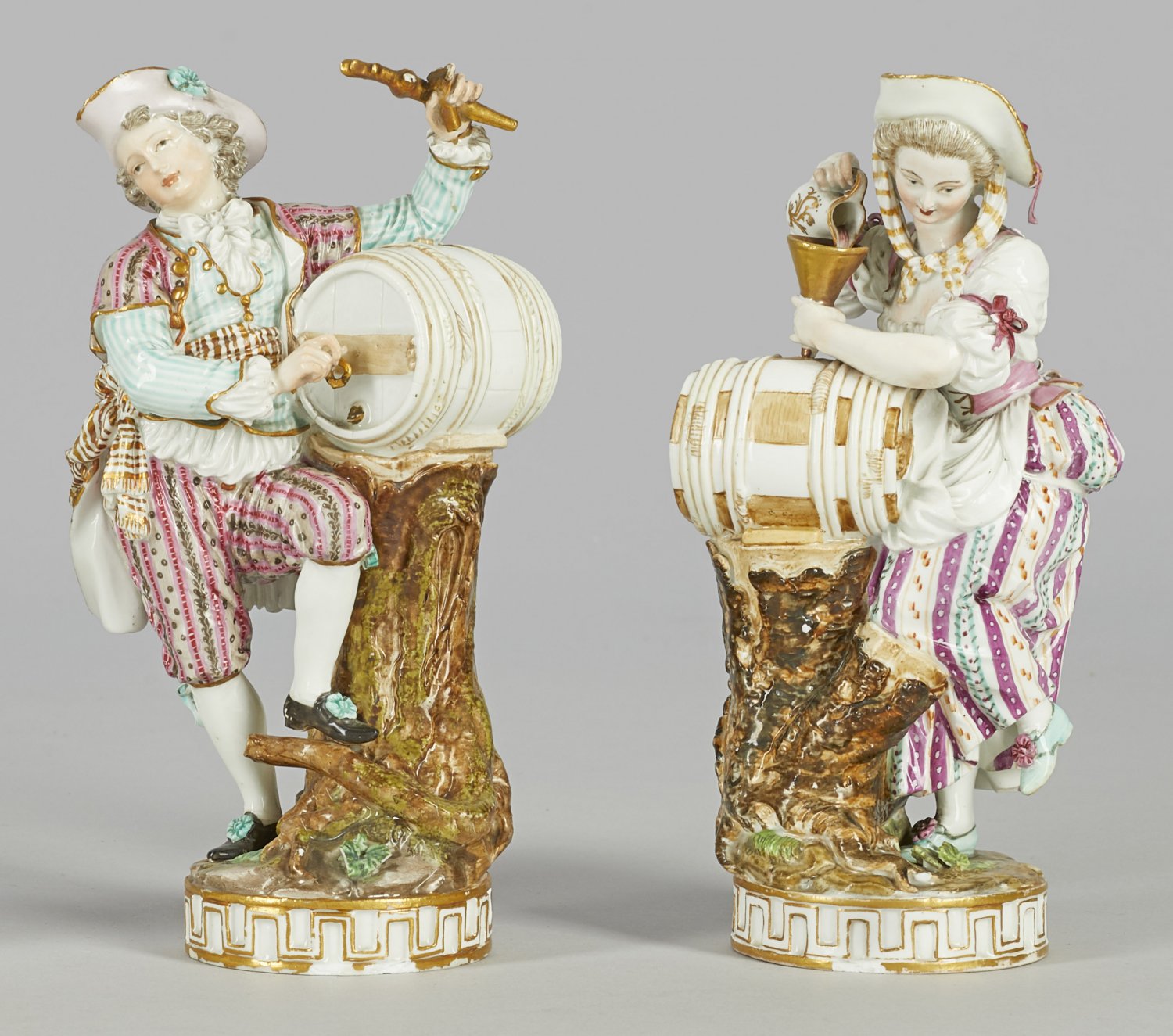 Paar Winzerfiguren Runde Sockel mit reliefierter Ornamentbordüre. An einem Baumstamm stehende junge Dame bzw. junger Herr, sich auf ein Weinfass stützend. In der Hand einen Krug bzw. einen Zapfhahn haltend. Polychrome Malerei mit Goldstaffage. Entw. Michel Victor Acier. Best.; Schwertermarke. H. 16,5 cm.