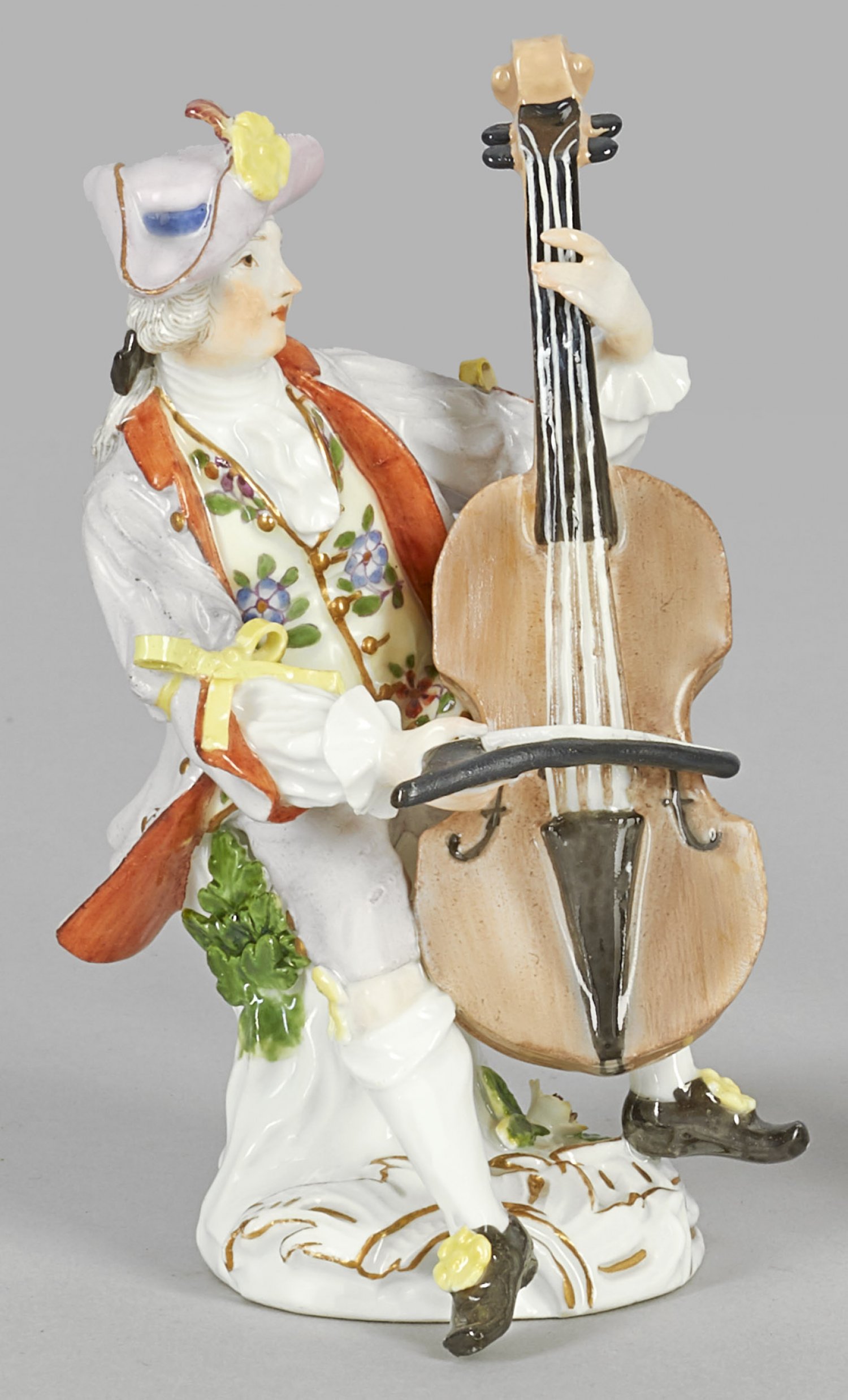 Cellist aus der Galanten Kapelle Auf Rocaillesockel mit Baumstumpf sitzender Cellist. Die aus insgesamt 16 Figuren bestehende Galante Kapelle wurde in den 1750er Jahren von Meyer und Kaendler entworfen. Polychrome Malerei mit wenig Gold. Entw. Friedrich Elias Meyer. Minim. rest.; Undeutl. Schwertermarke auf unglasiertem Boden. H. 12,5 cm.