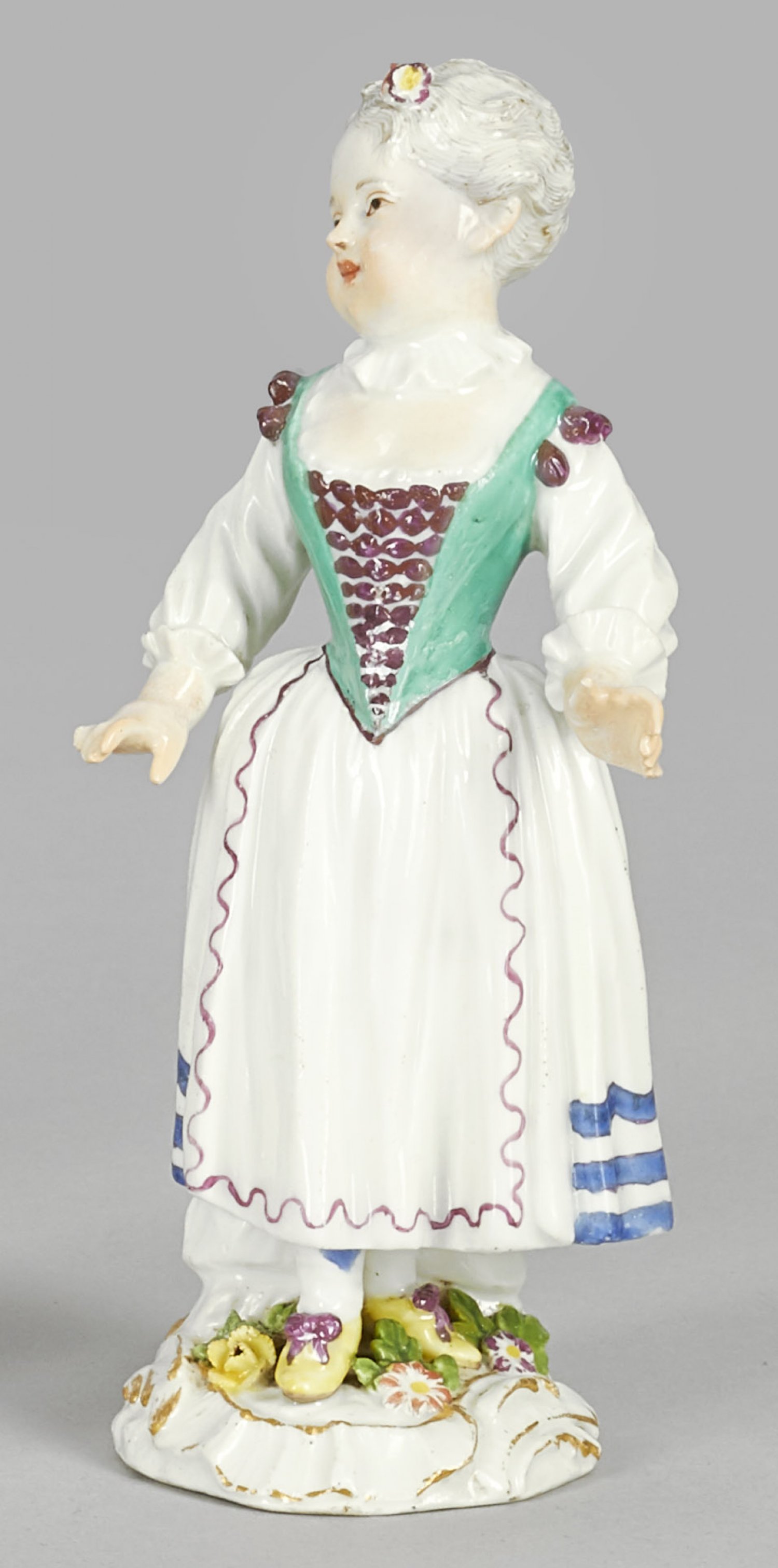 Mädchen als Komödienkind aus der Serie "Komödienkinder". Auf rocaillereliefiertem, mit plastischen Blüten und Blättern belegtem Sockel stehendes Mädchen in sommerlicher Kleidung. Polychrome Malerei mit wenig Gold. Minim. rest.; Schwertermarke. H. 12 cm.