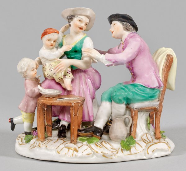 Bauernfamilie Auf einem mit plastischen Blüten und Blättern belegten Rocaillesockel ein am Tisch sitzendes Bauernpaar mit zwei Kindern. Polychrome Malerei und Goldstaffage. Ritznr. "104". Minim. rest.; Schwertermarke. H. 11 cm.