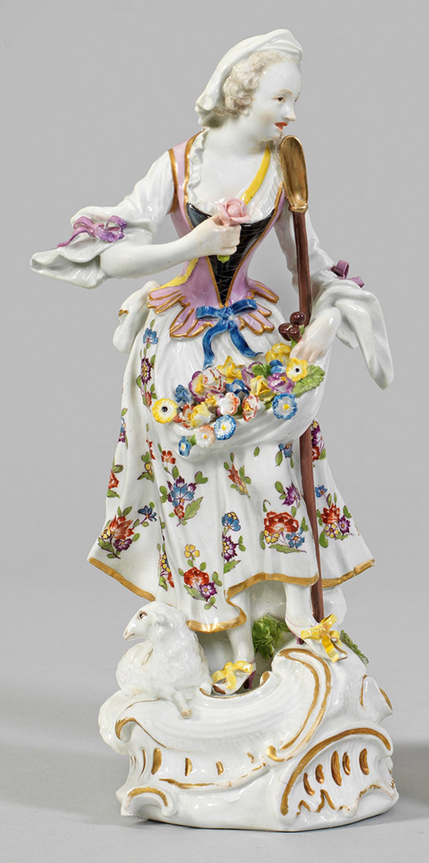 Schäferin Auf rocaillereliefiertem Sockel in sommerlicher Kleidung stehende junge Dame mit Hirtenstab und Schultertasche, die Schürze mit plastischen Blumen gefüllt. Zu ihren Füßen ruhendes Schaf. Polychrome Malerei mit Goldkonturierung. Entw. Johann Joachim Kaendler. Unw. rest.; Schwertermarke. H. 27 cm.