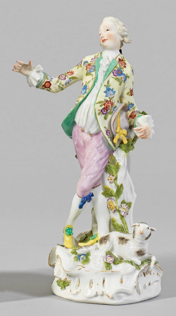 Schäfer Auf rocaillereliefiertem, mit plastischen Blüten und Blättern belegtem Sockel stehender, junger Herr in einem mit Indianischen Blüten gemusterten Gehrock, unter dem linken Arm einen Hut tragend. Zu seinen Füßen ruhendes Schaf. Entw. Johann Joachim Kaendler. Rest.; Schwertermarke. H. 26,5 cm.