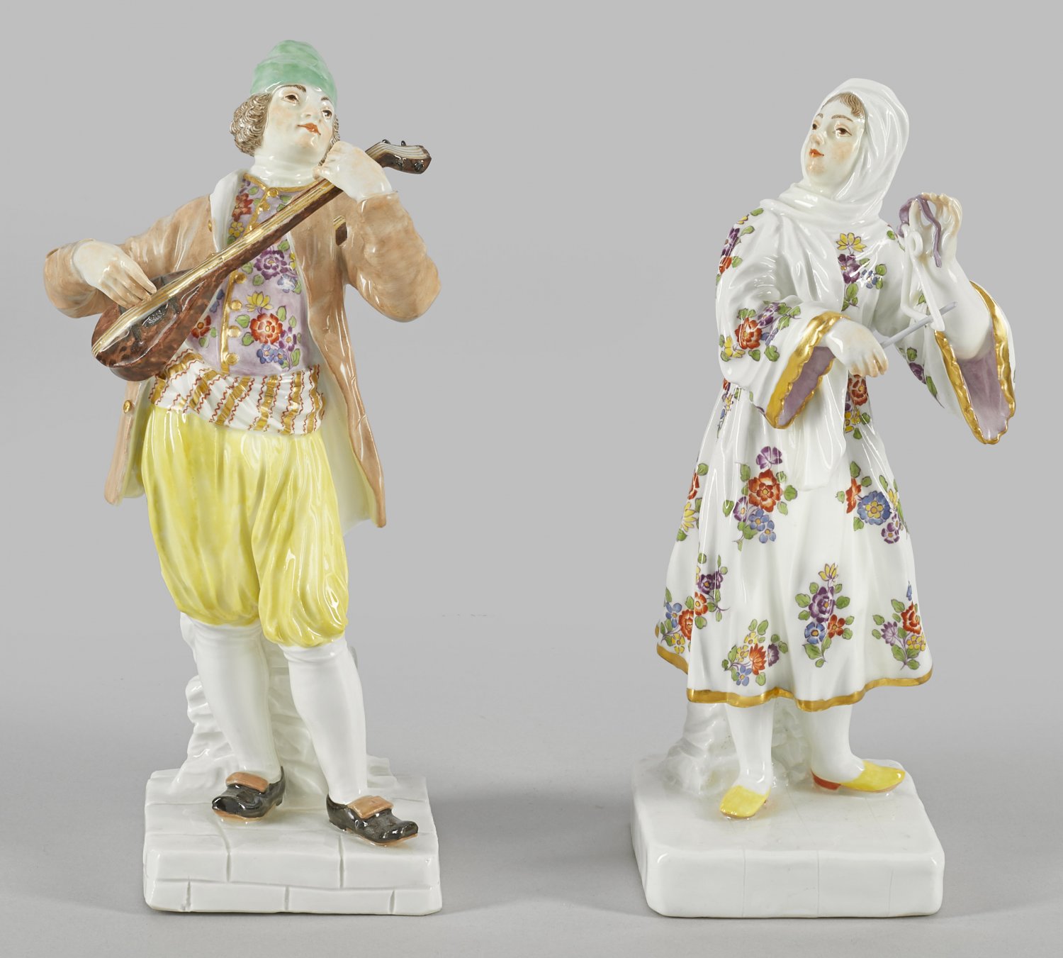 Paar griechische Musikanten Gegenstücke. Auf quadratischem Sockel stehender Grieche in Volkstracht mit brauner Jacke über farbig gemusterter Weste und zitronengelber Pluderhose, die Bouzouki spielend. Als Gegenstück stehende junge Griechin, die Triangel schlagend. Bekleidet mit weißem Kopftuch und einem mit Indianischen Blumen gemustertem Kleid. Polychrome Malerei mit reicher Goldstaffage. Entw. Johann Joachim Kaendler oder Johann Friedrich Eberlein. Minim. rest.; Schwertermarke. H. 19,5 cm und 20 cm.