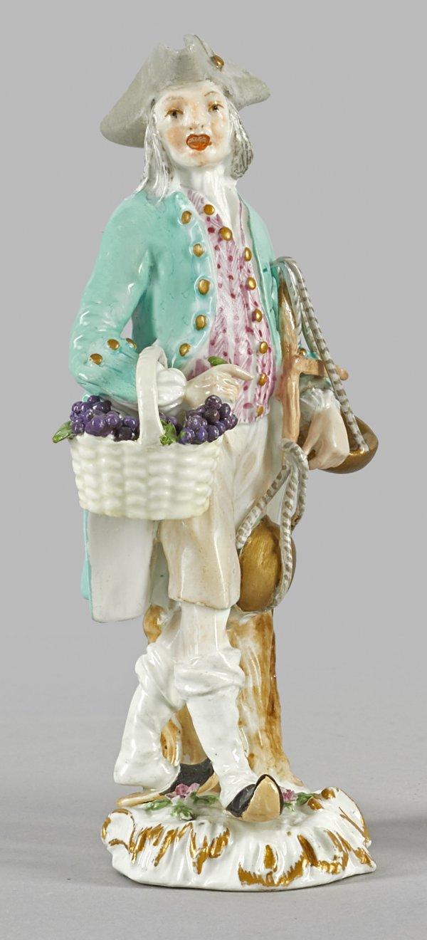 Traubenverkäufer aus der Serie "Cris de Paris" Auf rocaillereliefiertem Sockel stehender Ausrufer, im linken Arm eine Waage haltend, an seinem rechten Arm einen mit blauen Trauben gefüllten Korb tragend. Polychrome Malerei mit Goldstaffage. Entw. Johann Joachim Kaendler/Peter Reinicke. Rest.; Schwertermarke. H. 14,5 cm.