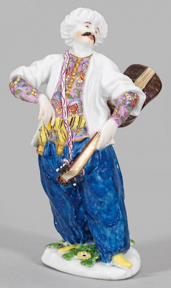 Türke mit Gitarre Auf unregelmäßiger, mit plastischen Blüten und Blättern belegter Sockelplatte stehender, schnurrbärtiger Orientale mit Turban in blauer Hose, blütengemustertem Hemd und weißer Jacke. In der linken Hand eine Gitarre haltend. Polychrome, teilw. Goldgehöhte Malerei. Entw. Peter Reinicke. H. 17,5 cm.