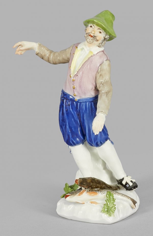 Holländischer Fischer Auf felsigem, mit plastischen Blättern belegtem Sockel stehender Fischer in blauer Kniebundhose, weißem Hemd und purpurfarbener Weste. Der Kopf bedeckt von einem Fischerhut. Zu den Füßen liegende Fische. Polychrome Malerei. Entw. Peter Reinicke. Minim. rest.; Schwertermarke. H. 14 cm.