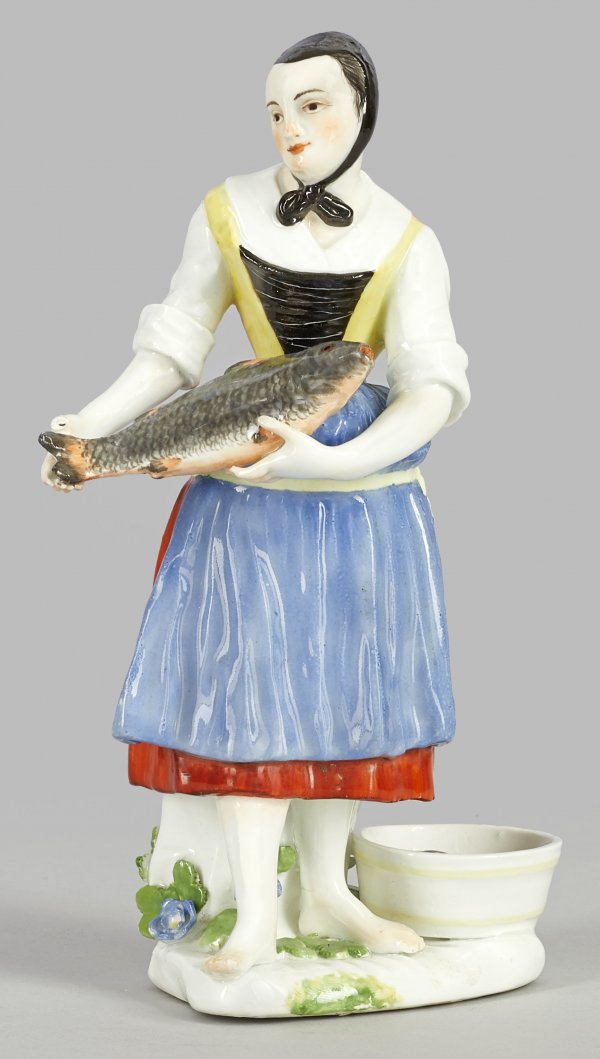 Fischerin Auf unregelmäßigem, mit plastischen Blüten und Blättern belegtem Sockel stehende Fischerin, einen Karpfen zum Verkauf anbietend. Zu ihren Füßen eine mit weiteren Fischen gefüllte Schale. Polychrome Malerei. Goldstaffage. Entw. Johann Joachim Kaendler. Minim. best./rest.; Schwertermarke. H. 19 cm.