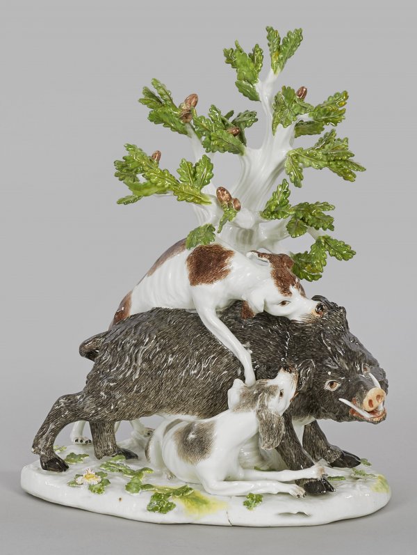 "Eberhatz"-Gruppe Auf unregelmäßigem, von plastischen Blüten und Blättern belegtem Sockel vollplastische, szenische Darstellung eines Ebers, gestellt und angefallen von zwei Jagdhunden, sog. Saufindern. Rückseitig stehender Eichenbaum. Polychrome Malerei mit wenig Gold. Entw. Johann Joachim Kaendler, 1746. Unw. rest.; Schwertermarke. H. 24,5 cm.