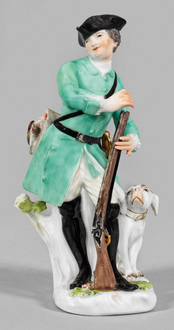 Jäger mit Büchse und Hund Auf einem mit plastischen Blüten und Blättern belegten Sockel stehender Jäger in seegrünem Rock, weißer Hose und schwarzen Stulpenstiefeln. Das Haar von einem Dreizack bedeckt. In den Händen ein aufrecht stehendes Jagdgewehr, auf dem Rücken eine Felltasche mit Rebhuhn tragend. Zu seinen Füßen sitzender Vorstehhund. Polychrome Malerei mit wenig Gold. Entw. Johann Friedrich Eberlein. Unw. rest./best.; Schwertermarke. H. 17,5 cm.