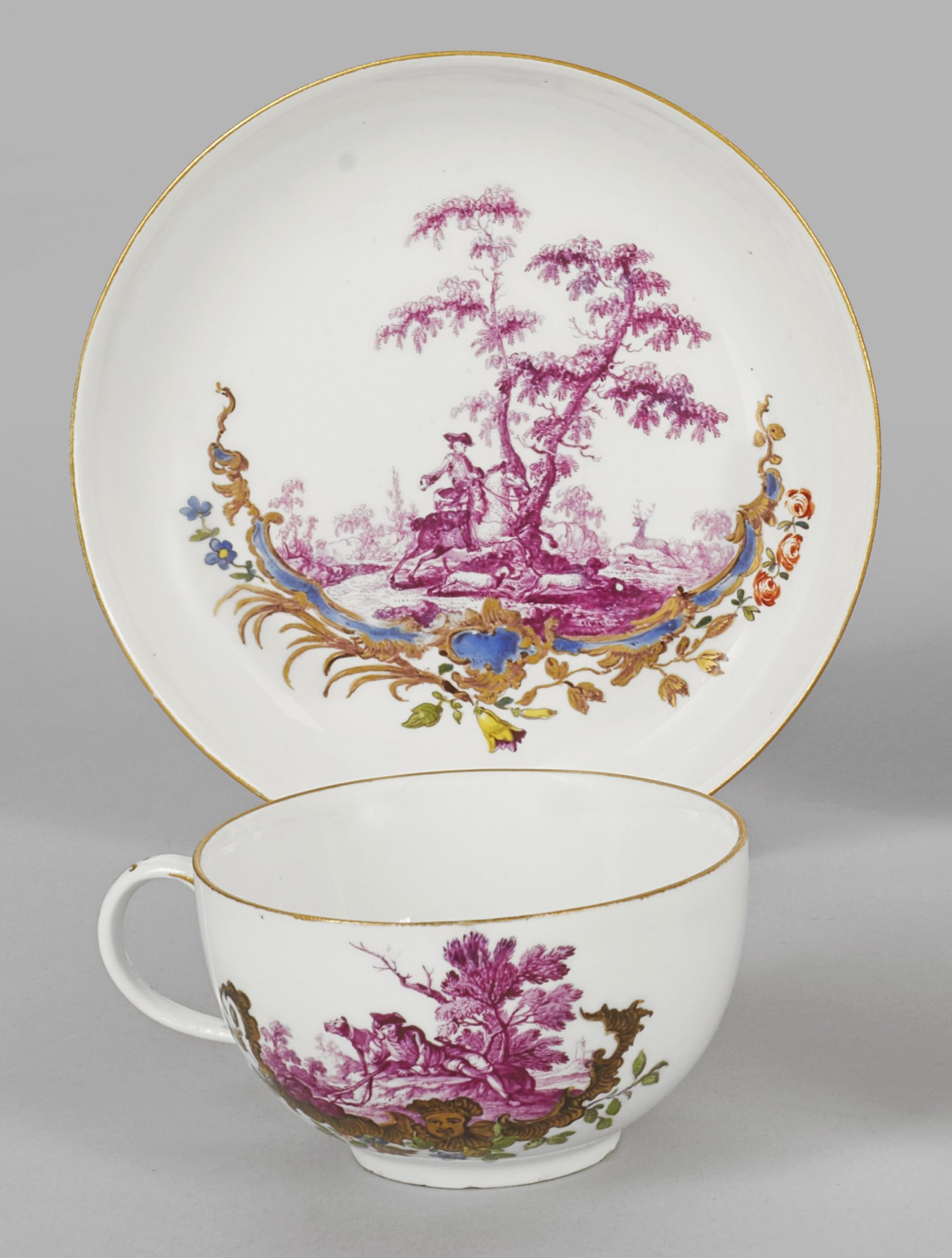 Ziertasse mit Jagddekor auf Untertasse. Halbkugelige Form mit gebogtem Henkel. Beidseitig der Wandung und im Spiegel von Rocaillen mit farbigen Blüten gerahmte Jagdszenen nach Johann Elias Ridinger. Polychrome und feine Purpur-Camaieumalerei wohl von Gottlob Sigmund Birckner. Schwertermarke. Tassen-H. 4,5 cm.