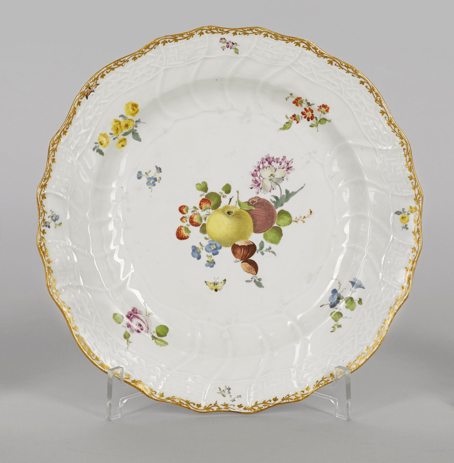 Zierteller mit Früchtedekor Runde Form mit passig geschweiftem Rand. Reliefdekor "Neubrandenstein". Im vertieften Spiegel feines Früchtebukett, umgeben von gestreuten Blüten und Blütenzweigen in polychromer Malerei. Am Rand best.; Umlaufende Goldspitzenbordüre. Schwertermarke. D. 24 cm.