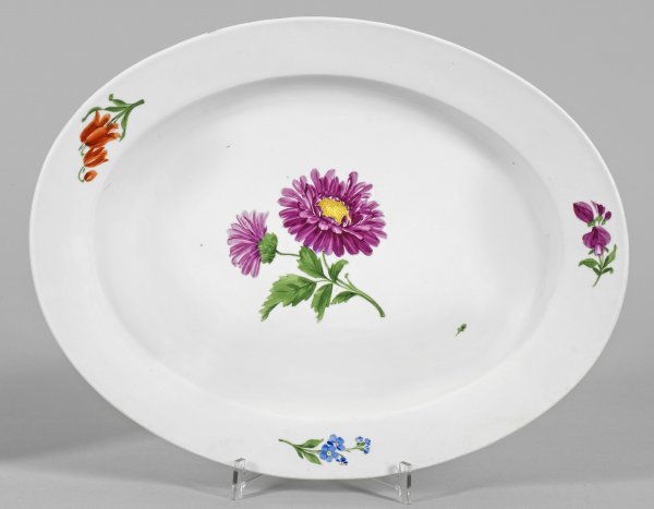 Große Zierplatte mit Blumendekor Ovale Form. Im vertieften Spiegel und auf der Fahne farbenfroher Blumendekor in polychromer Malerei. Rand best.
