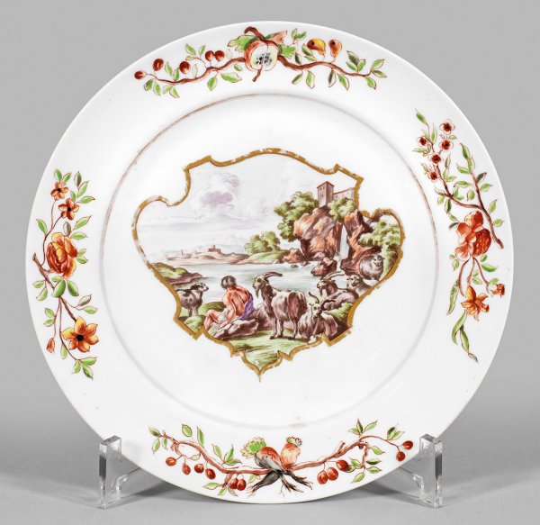 Runde Form. Im leicht vertieften Spiegel eine goldkonturierte, schildförmige Reserve mit bildmäßig angelegter Flußlandschaft mit lagernden Hirten und Tivoli-Motiv im Stil von Claude Lorrain. Auf der Fahne langgestreckte Obst- und Blütenzweige. Polychrome Malerei von Franz Ferdinand Mayer in Preßnitz. Haarriss. Minim. ber.; Schwertermarke. D. 21 cm.