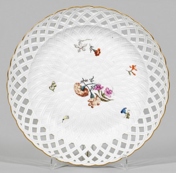Große Anbietschale mit Holzschnittblumen Runde, gemuldete Form mit passigem, goldstaffiertem Rand. Geflechtartig durchbrochen gearbeitete Fahne, übergehend in flächendeckendes Korbflechtrelief im Spiegel. Feiner Dekor aus umrisshaften, sog. Holzschnittblumen. Zentrales, farbenprächtiges Blumengebinde aus Nelken bzw. Pfingst-Nelke, umgeben von verschiedenen Streublumen in polychromer Malerei. Schwertermarke. D. 34,5 cm.