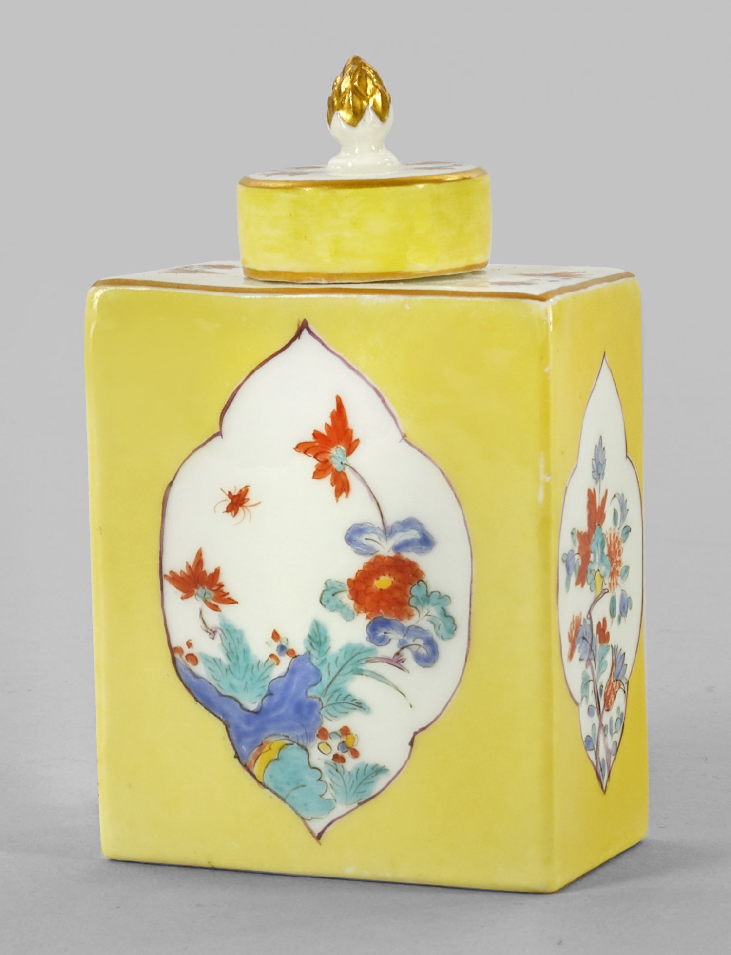 Gelbfond-Teedose mit Kakiemondekor Hochrechteckige, gerade Form mit kurzem, zylindrischem Hals. Übergreifender Deckel, mittig vergoldeter Pinienknauf. Allseitig, in zitronengelbem Fond ausgesparte, purpurfarben konturierte, vierpassige Reserven mit feinem Kakiemondekor nach japanischem Vorbild. Schauseitiges Motiv mit Chrysanthemenzweigen, hinter einem Fels und Farn emporwachsend. Auf der Rückseite verschiedene Päonienzweige mit darüber fliegendem Vogel. Auf den Schmalseiten korrespondierender Dekor aus aufsteigenden Chrysanthemen, Schulter und Deckel mit asiatischen Blütenzweigen. Polychrome Malerei in Eisenrot, Emailblau, Seegrün, Purpur und Gelb. Formerzeichen für Andreas Schiefer (seit 1726 tätig). Schwertermarke. H. 11 cm.