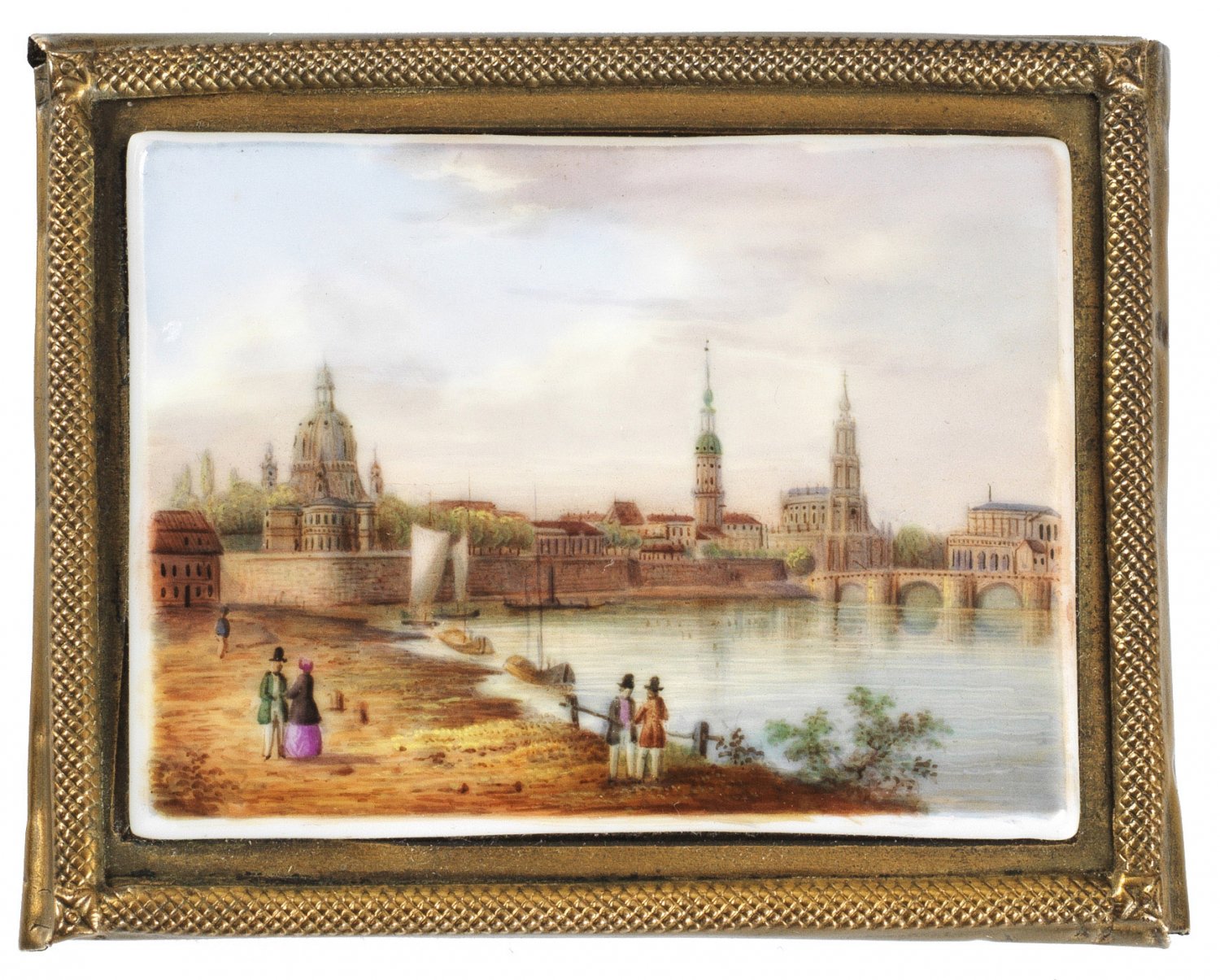 Porzellanminiatur mit Dresden-Ansicht Querrechteckige Form. Ansicht der Stadt Dresden vom Elbufer aus. Im Hintergrund u. a. mit der Frauenkirche, der Hofkirche und einem Ausschnitt der Augustusbrücke. Der Weg am Elbufer mit Figurenstaffage und mehreren Fischerbooten auf dem Wasser. Feine polychrome Malerei. Messingrahmen. 6,5 cm x 4 cm.