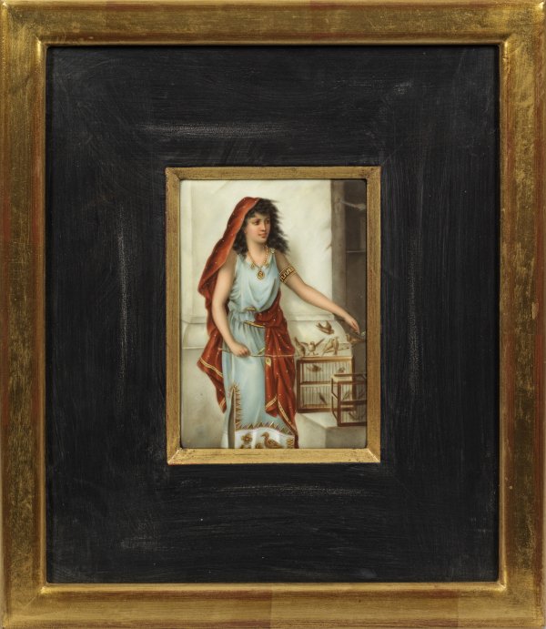 Rechteckige Bildplatte mit dunkelhaariger Orientalin in hellblauem, von ägyptisierenden Motiven gesäumtem sowie rotem, gold gepunktetem Tuch, sich um ihre Vögel kümmernd. Feine polychrome Malerei mit Goldhöhungen. Nach einem Gemälde des belgischen Malers Pierre Olivier Joseph Coomans. Eingepresste Zepter- und KPM-Marke. Vergoldeter Holzrahmen mit schwarz lackierter Blende. Platte 17,5 cm x 12,5 cm. Rahmen 40,5 cm x 35,5 cm.