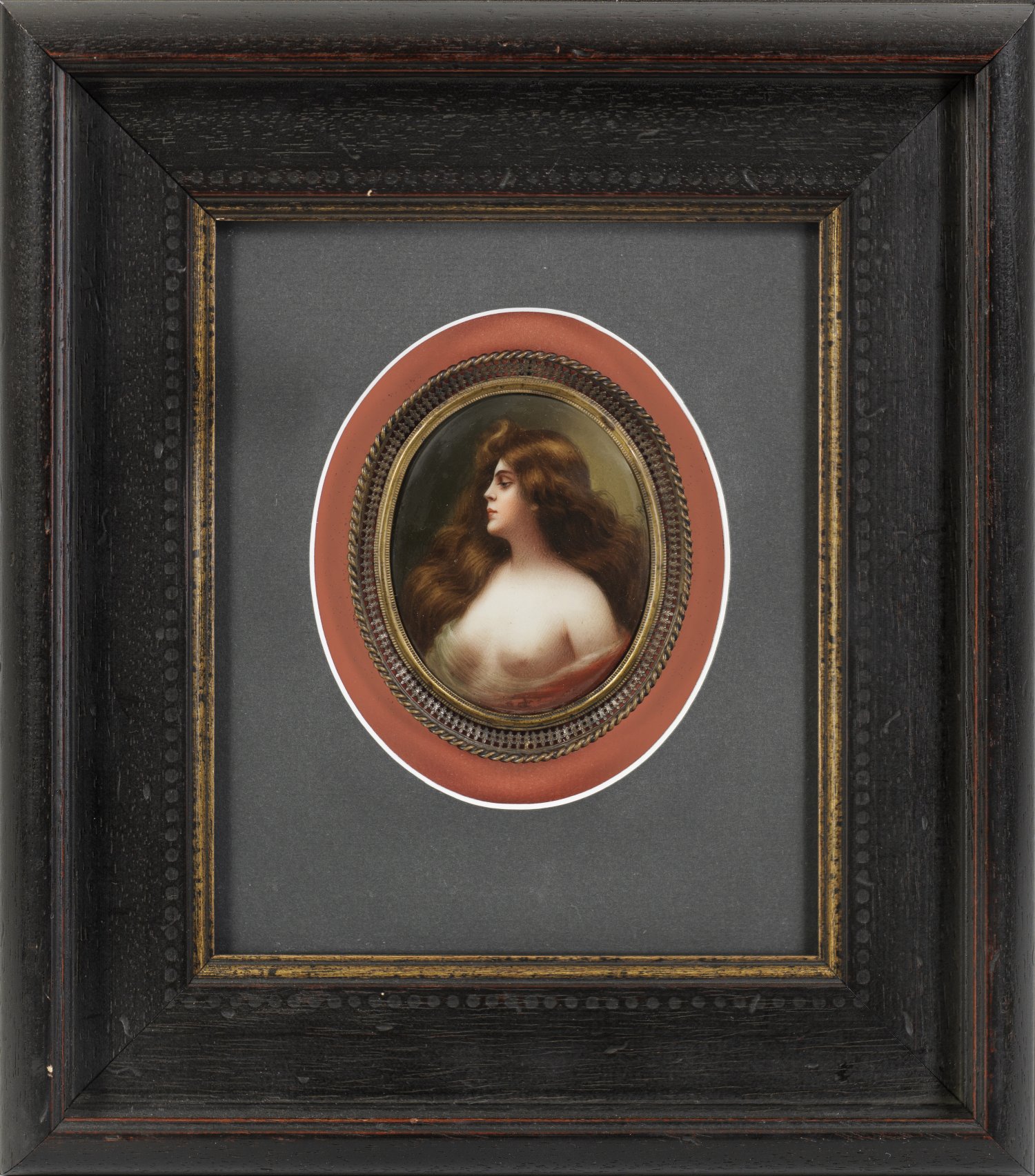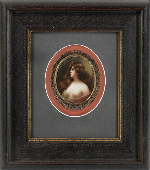 Porzellangemälde Ovale Bildplatte. Porträt einer jungen Dame im Halbakt mit voluminösen, braunen, langen Haaren. Um den Oberkörper lediglich ein locker fallendes, durchsichtig weißes und rotes Tuch gelegt. Nach dem Gemälde "Erbluth" von Angelo Asti (1847-1903) in feiner polychromer Malerei. Undeutlich signiert. Bildplatte mit fein durchbrochen gearbeitetem, ornamentiertem Messingrahmen über ochsenblutrotem Papierkarton befestigt, umgeben von schwarzem Passepartout hinter Glas und dunkelbraunem, breitem Rahmen. Bildplatte ca. 8 cm x 7 cm. Holzrahmen 29,2 cm x 26,2 cm.
