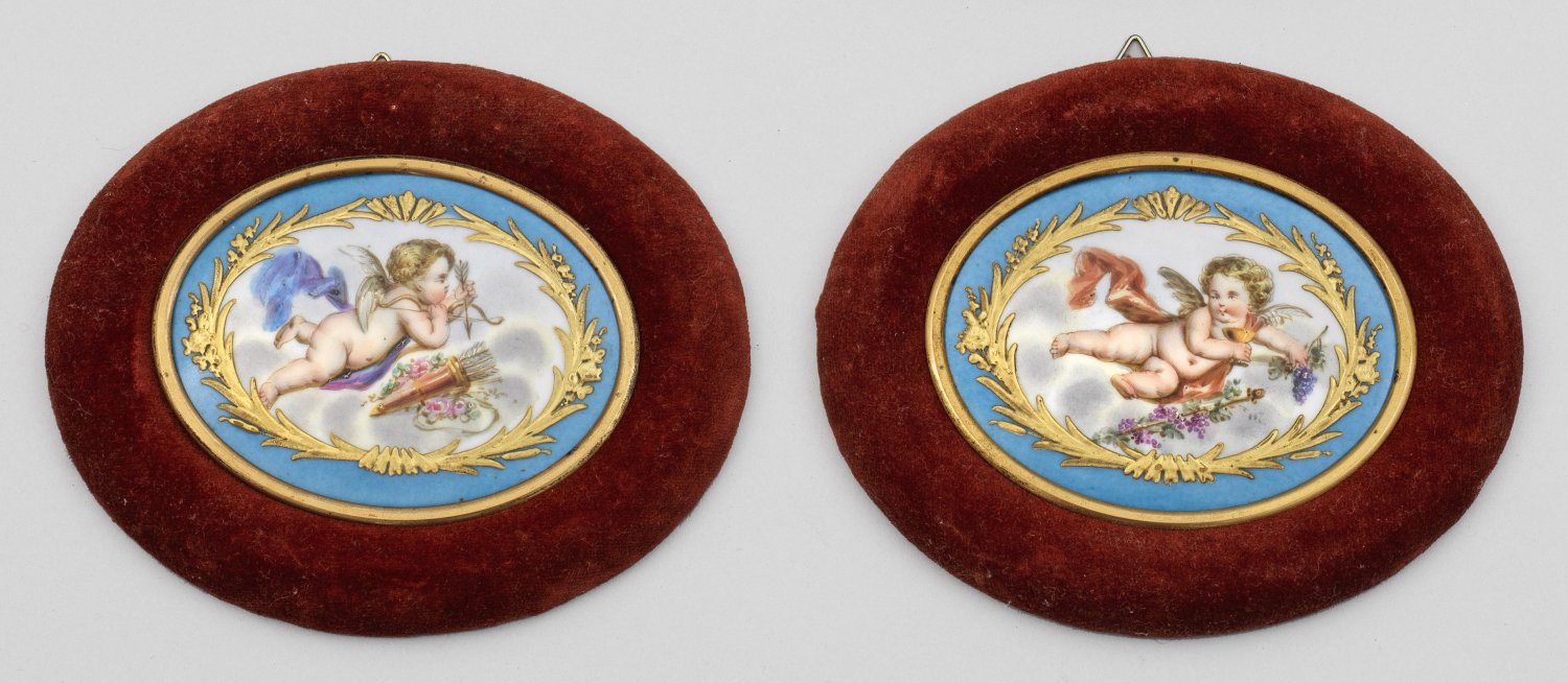 Paar Porzellanbilder Ovale Bildplatten. Zentrale Darstellungen von zwei über den Wolken fliegenden Putten. Gerahmt von hellblauem Fond und gemalten, goldenen Ranken und Blüten. Ein Putto mit einem Becher und Weinranken bzw. -reben als Allegorie des Herbstes. Der andere Putto mit Köcher, Pfeilen und Bogen, gerahmt von Blumen, als Allegorie des Frühlings. Rahmen mit rotem Samt bezogen. Platten ca. 10 cm x 7,5 cm.