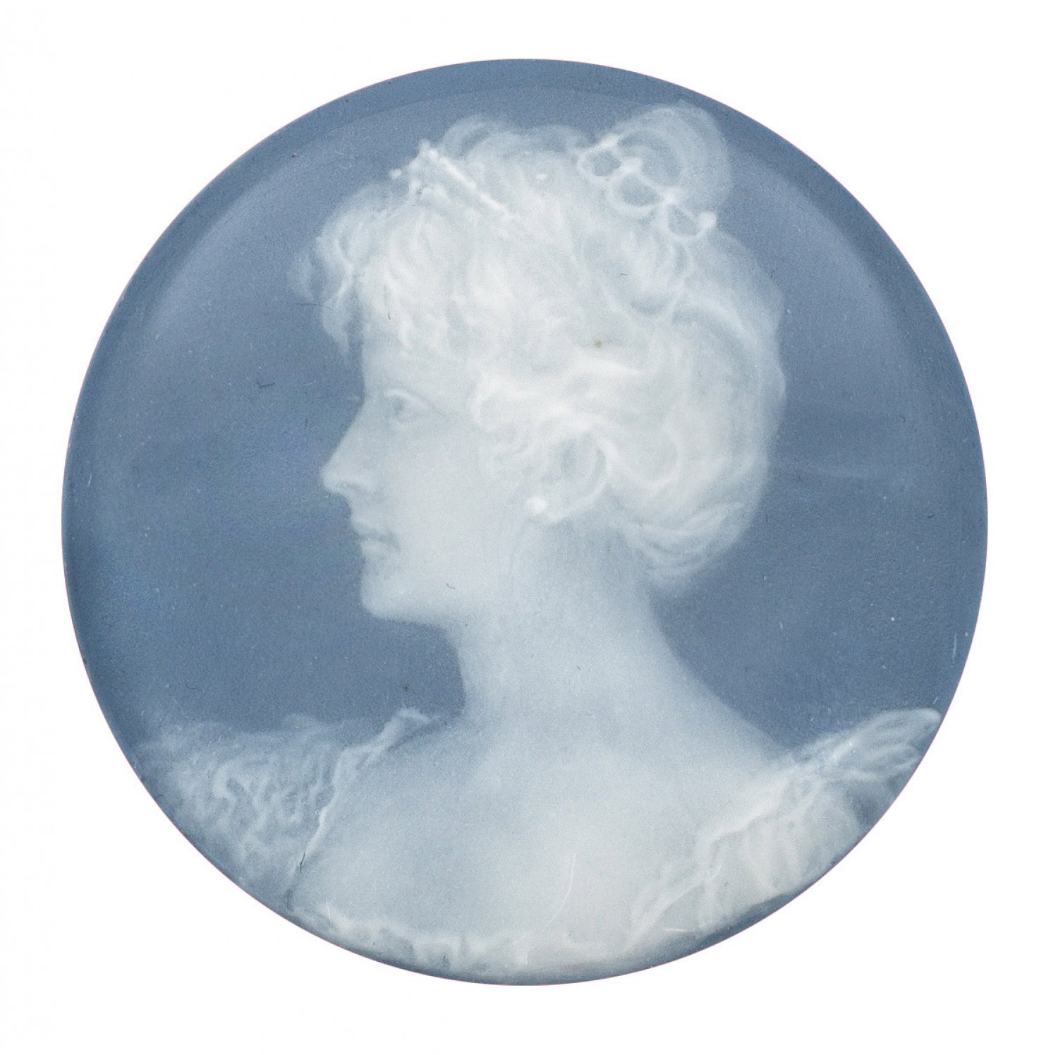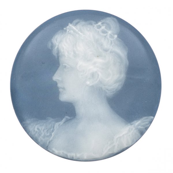 Plakette mit Frauenporträt in Pâte-sur-pâte Runde, gewölbte Form. Schauseitiges Büstenporträt einer jungen Frau mit geknoteter Hochsteckfrisur, das Haar von einem Diadem bekrönt, wohl Erzherzogin Maria Josepha von Sachsen (1867-1944). Feine, weiße Pâte-sur-pâte auf hellblauem Fond. Schwertermarke. D. 4,5 cm.