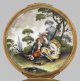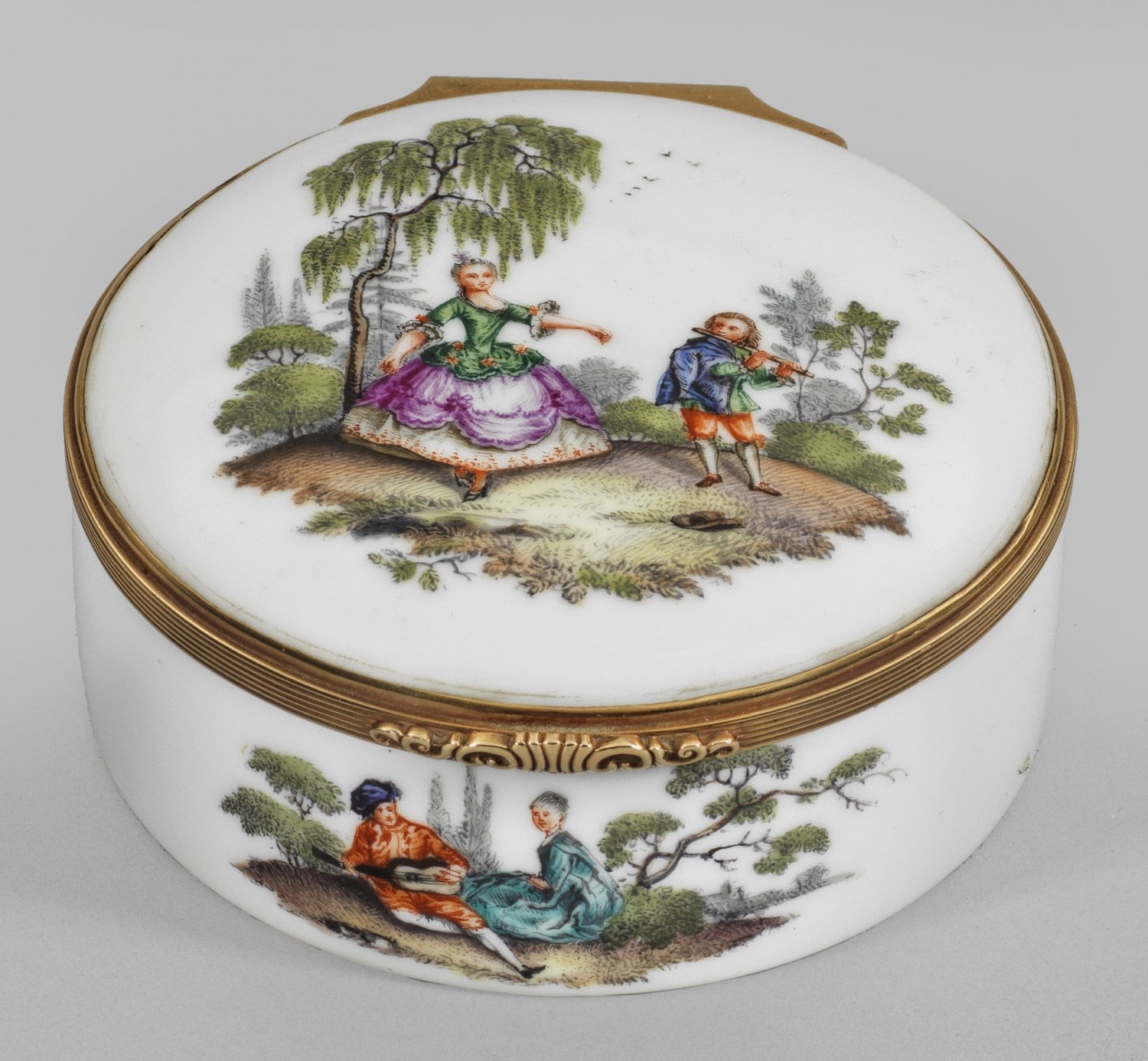 Tabatiere mit Watteauszenen Porzellan. Runde Form mit leicht gehöhtem Scharnierdeckel. Allseitig feine Watteauszenen mit galanten Paaren beim Musizieren bzw. bei der Konversation in baumbestandener Landschaft. Auf dem Deckel tanzende Hofdame in Begleitung eines Querflötenspielers. Deckelinnenseite mit galantem Paar in inniger Umarmung, vor einem Kirschbaum sitzend und Kirschen verspeisend. Auf dem Boden dargestellte Edeldame mit Gitarre. Feine polychrome Malerei. Profilierte, vergoldete Montierung mit ornamentiertem Daumenrast. Innenwandung mit Resten von Vergoldung. H. 4,5 cm. D. 8,5 cm.