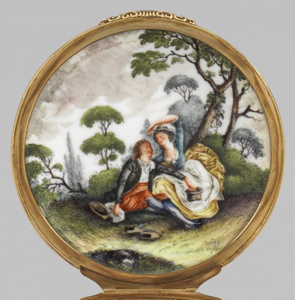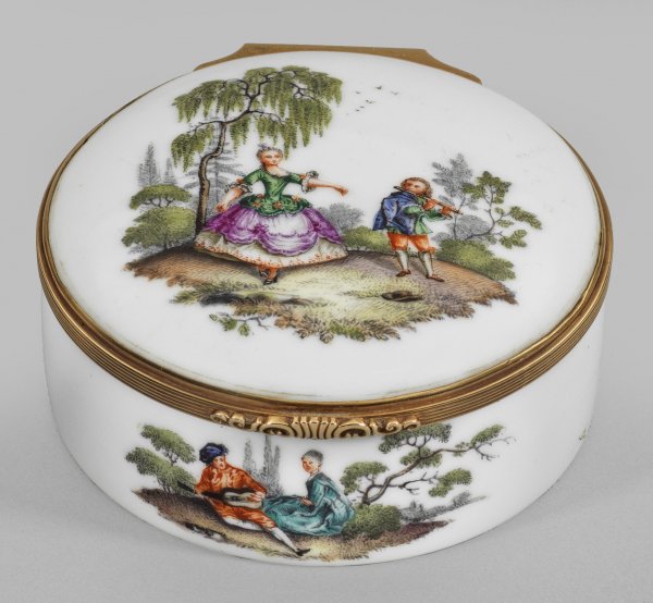 A porcelain tobacco box with Watteau scenes.