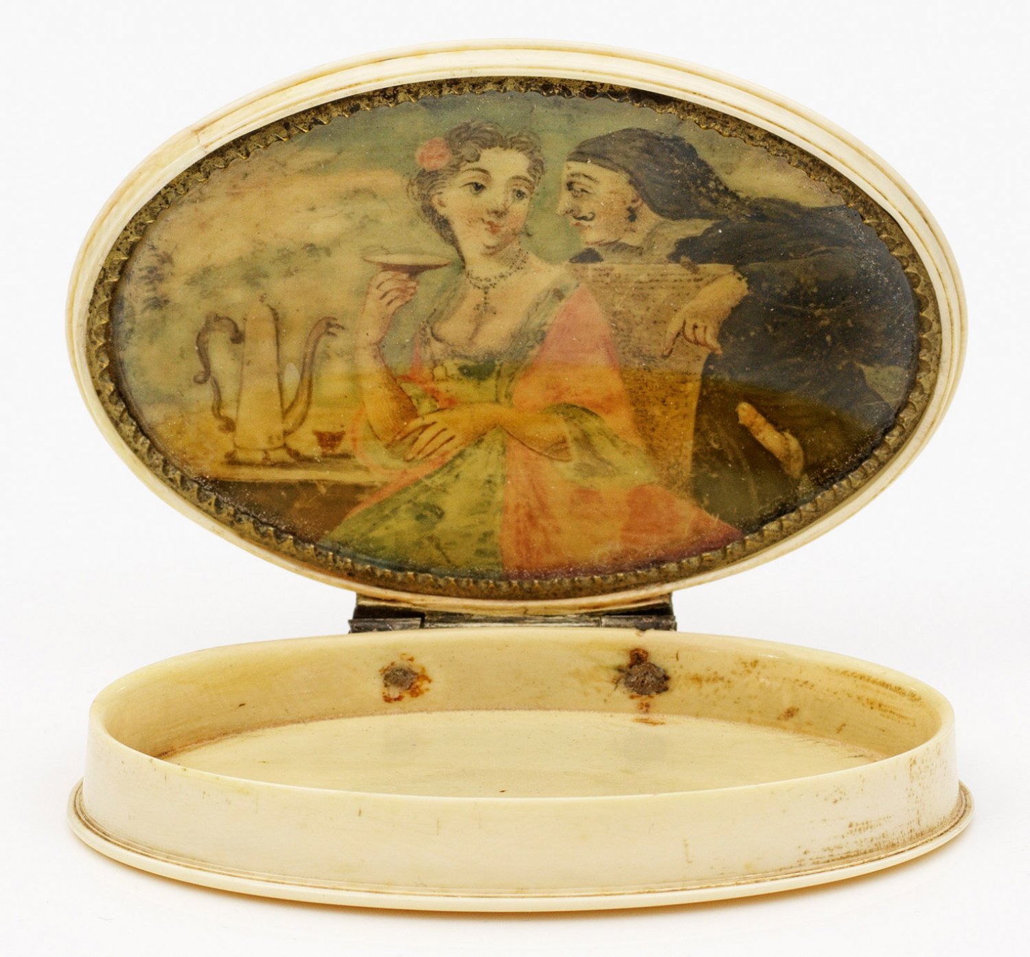 Elfenbeindose mit erotischer Malerei Elfenbein gedrechselt, in ovaler Form mit konzentrischen Ellipsen. Scharnierter, aufklappbarer Deckel. Im Innendeckel erotische Szenerie in feiner polychromer Malerei. Mann mit schwarzem Gewand, Kopfbedeckung und schwarzem Schnurrbart verführt eine junge Dame in rosa-hellblauem Rokoko-Kleid beim Kaffeetrinken. Tempera auf Elfenbein. Malerei verglast, mit Messingblende. H. 2 cm. 9 cm x 6 cm.