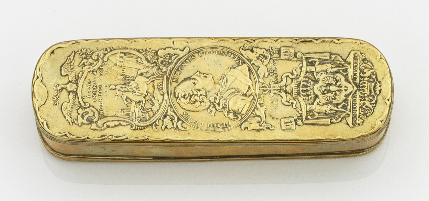 Iserlohner Tabakdose Messing mit geprägtem Reliefdekor. Auf dem Deckel Profil-Darstellung von König Friedrich dem Großen, Reiterbildnis und preußisches Wappen mit Inschrift und ein Schild mit preußischem Adler und Fahnenträgern. Auf dem Boden 22 Vignetten mit siegreichen Schlachten Friedrich des Großen. Sign. Johan Henrich Giese (1716-1761). H. 3 cm. 16,5 cm x 5 cm.