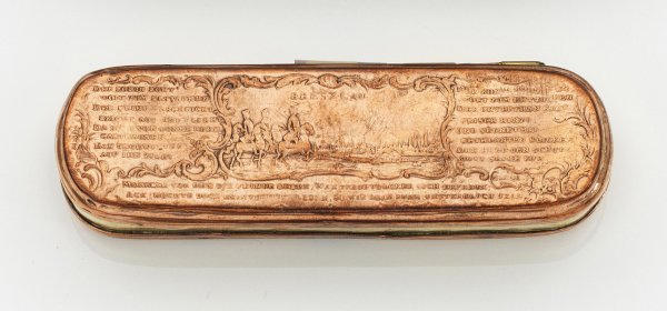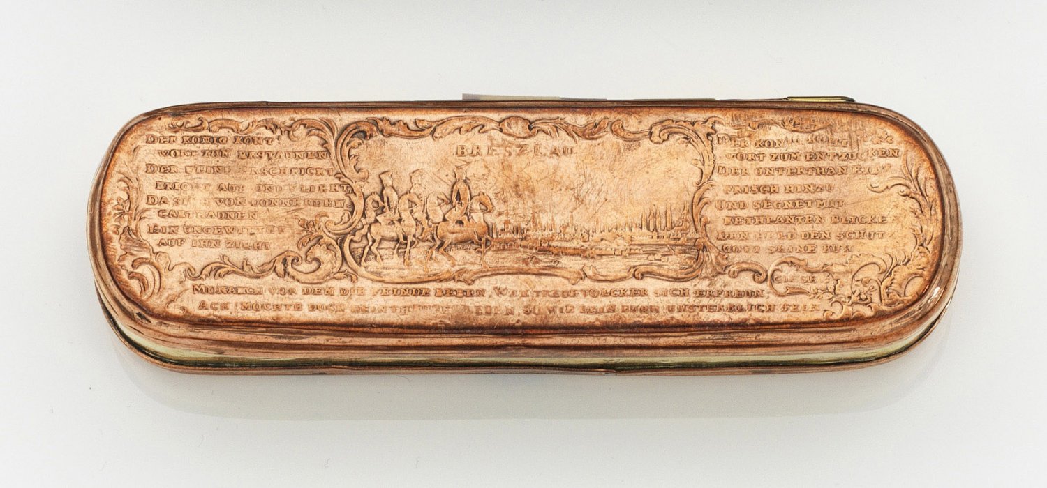Iserlohner Tabakdose Messing und Kupfer, geprägter Reliefdekor. Mittig auf dem scharnierten Deckel eine von Ranken gerahmte Kartusche mit betitelter Darstellung der Belagerung von Breslau, umgeben von Inschriften und Voluten. Auf dem Boden unter einer Inschrift die Schlachtendarstellung von Zorndorf (25. August 1758), gerahmt von zwei Reitern. R. u. sign. Johan Henrich Giese (1716-1761). H. 3 cm. 15 cm x 4,5 cm.
