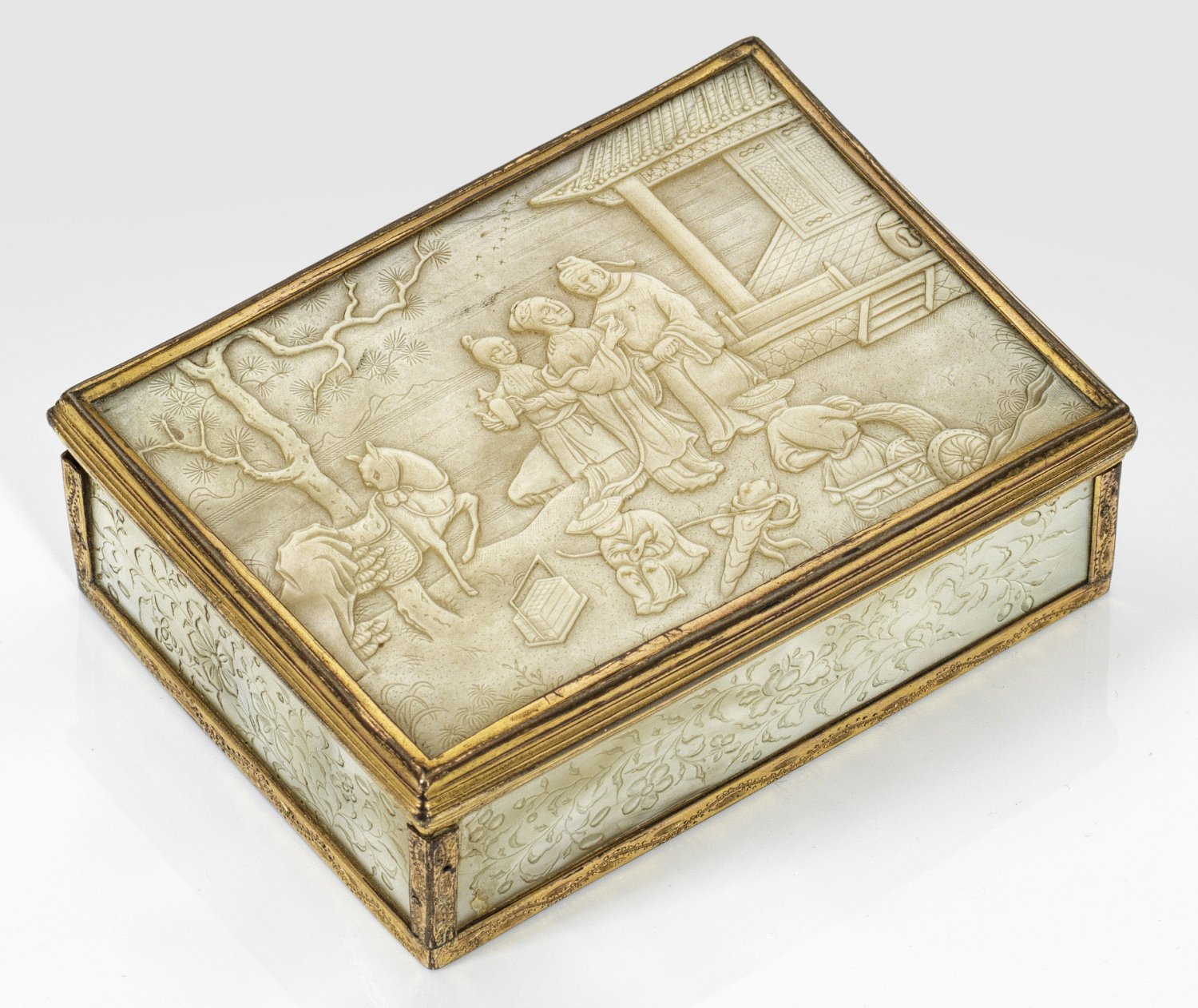 Kleine Perlmutter-Spielsteindose Perlmutter mit vergoldeter Messingmontierung. Rechteckiger Korpus mit schmaler, teilw. profilierter und ziselierter Randmontierung. Auf gerader Wandung umlaufend gravierte und stilisierte Blütenranken. Auf dem Deckel eine fein geschnitzte Chinoiserie mit szenischer Darstellung von zwei Frauen, einem Mann eine Tasse Tee anbietend. Links von ihnen ein gesatteltes Pferd unter einem Baum. Vor ihnen zwei spielende Kinder. Im Hintergrund der Ausschnitt eines Hauses sowie eine weite, bergige Landschaft mit Bäumen. Innen 60 rechteckige und runde Jetons aus Perlmutter mit gravierten floralen und figürlichen Darstellungen. Minim. besch.; H. 3 cm. 9 cm x 6,3 cm.